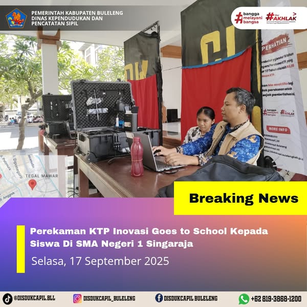Disdukcapil Goes to School: Inovasi Mendekatkan Layanan Adminduk Bagi Generasi Muda. Dinas Kependudukan dan Pencatatan Sipil (Disdukcapil) Kabupaten Buleleng terus berupaya menghadirkan pelayanan yang cepat, mudah, dan dekat dengan masyarakat. Salah satu inovasi yang mendapat perhatian adalah program "Disdukcapil Goes to School”, yaitu layanan jemput bola yang secara khusus menyasar pelajar di sekolah-sekolah. Program ini dilatarbelakangi oleh masih rendahnya kepemilikan KTP-el di kalangan pelajar yang telah berusia 17 tahun. Banyak siswa belum memiliki kesempatan untuk datang ke kantor Disdukcapil karena terbentur jarak, waktu, maupun kesibukan belajar. Melihat kondisi tersebut, Disdukcapil mengambil langkah proaktif dengan menghadirkan layanan langsung ke sekolah, sehingga pelajar bisa melakukan perekaman data dan pengurusan dokumen kependudukan tanpa harus meninggalkan aktivitas belajar.