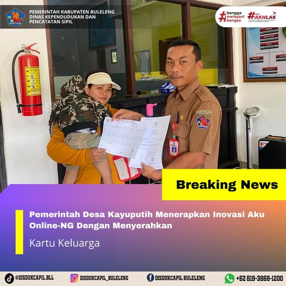 Pemerintah Kabupaten Buleleng melalui Dinas Kependudukan dan Pecatatan Sipil (Disdukcapil) Kabupaten Buleleng memaksimalkan serta mempermudah pelayanan kependudukan masyarakat dengan beberapa inovasi, melalui aplikasi AKU Online-NG. Dimana dalam penerapan aplikasi Aku Online-NG tersebut masyarakat tidak perlu lagi datang ke Dinas Dukcapil untuk melakukan pelayanan langsung cukup dengan datang ke Desa nanti akan dibantu oleh operator Desa masing-masing. Di Desa Kayuputih Kecamatan Banjar, telah diserahkan dokumen kependudukan berupa Kartu Keluarga atas nama Made Wari Banjar Dinas menagung Desa Kayuputih yang diserahkan secara langsung oleh Pemerintah Desa Kayuputih Kecamatan Banjar, Selasa (25/11).
