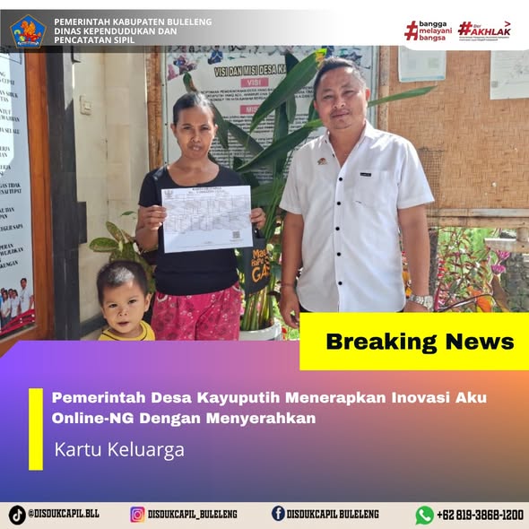 Pemerintah Kabupaten Buleleng melalui Dinas Kependudukan dan Pecatatan Sipil (Disdukcapil) Kabupaten Buleleng memaksimalkan serta mempermudah pelayanan kependudukan masyarakat dengan beberapa inovasi, melalui aplikasi AKU Online-NG. Dimana dalam penerapan aplikasi Aku Online-NG tersebut masyarakat tidak perlu lagi datang ke Dinas Dukcapil untuk melakukan pelayanan langsung cukup dengan datang ke Desa nanti akan dibantu oleh operator Desa masing-masing. Di Desa Kayuputih Kecamatan Sukasada, telah diserahkan dokumen kependudukan berupa Kartu Keluarga atas nama Gede Sariata yang diserahkan langsung oleh Kelian Banjar Dinas Kayuputih Desa Kayuputih Kecamatan Sukasada bertempat di kantor Perbekel Desa Kayuputih, Kecamatan Sukasada, Kabupaten Buleleng, Rabu (29/10).