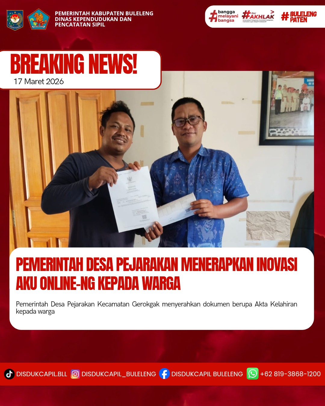 Pemerintah Kabupaten Buleleng melalui Dinas Kependudukan dan Pecatatan Sipil (Disdukcapil) Kabupaten Buleleng memaksimalkan serta mempermudah pelayanan kependudukan masyarakat dengan beberapa inovasi, melalui aplikasi AKU Online-NG. Dimana dalam penerapan aplikasi Aku Online-NG tersebut masyarakat tidak perlu lagi datang ke Dinas Dukcapil untuk melakukan pelayanan langsung cukup dengan datang ke Desa nanti akan dibantu oleh operator Desa masing-masing. Di Desa Pejarakan Kecamatan Gerokgak, telah diserahkan dokumen kependudukan berupa Akta Kelahiran atas nama Komang Kanaya Dhelia Sri Mahaputri & Kartu Keluarga atas nama Gede Pastiyasa yang diserahkan langsung oleh Pemerintahan Desa Pejarakan bertempat di Kantor Perbekel Desa Pejarakan, Kecamatan Gerokgak, Kabupaten Buleleng, Selasa (17/3).
