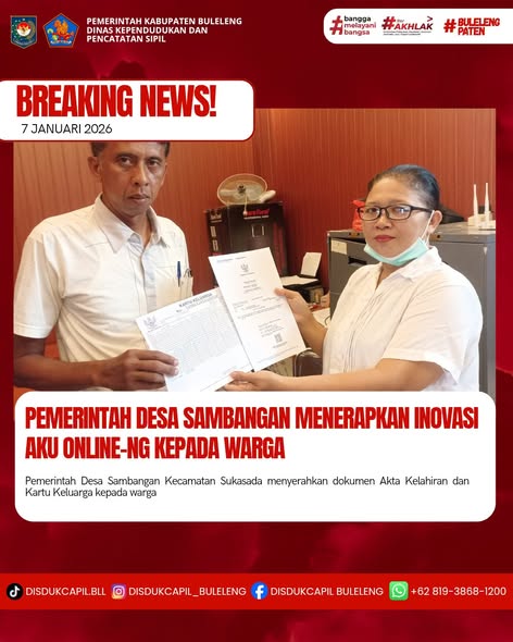 Pemerintah Kabupaten Buleleng melalui Dinas Kependudukan dan Pecatatan Sipil (Disdukcapil) Kabupaten Buleleng memaksimalkan serta mempermudah pelayanan kependudukan masyarakat dengan beberapa inovasi, melalui aplikasi AKU Online-NG. Dimana dalam penerapan aplikasi Aku Online-NG tersebut masyarakat tidak perlu lagi datang ke Dinas Dukcapil untuk melakukan pelayanan langsung cukup dengan datang ke Desa nanti akan dibantu oleh operator Desa masing-masing. Di Desa Sambangan Kecamatan Sukasada, telah diserahkan dokumen kependudukan berupa Akta Kelahiran atas nama I Putu William Vanther dan Kartu Keluarga atas nama I Putu Dodi Suliyanto diserahkan oleh Kasi Pemerintahan Desa Sambangan bertempat di Kantor Perbekel Desa Sambangan, Kecamatan Sukasada, Kabupaten Buleleng, Rabu (7/1).
