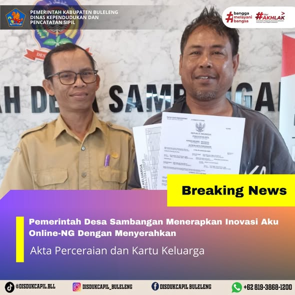 Pemerintah Kabupaten Buleleng melalui Dinas Kependudukan dan Pecatatan Sipil (Disdukcapil) Kabupaten Buleleng memaksimalkan serta mempermudah pelayanan kependudukan masyarakat dengan beberapa inovasi, melalui aplikasi AKU Online-NG. Dimana dalam penerapan aplikasi Aku Online-NG tersebut masyarakat tidak perlu lagi datang ke Dinas Dukcapil untuk melakukan pelayanan langsung cukup dengan datang ke Desa nanti akan dibantu oleh operator Desa masing-masing. Di Desa Sambangan Kecamatan Sukasada, telah diserahkan dokumen kependudukan berupa Akta Perceraian dan Kartu Keluarga atas nama Komang Arya Astana yang diserahkan oleh Pemerintahan Desa Sambangan kepada warga bertempat di Kantor Perbekel Desa Sambangan, Kecamatan Sukasada, Kabupaten Buleleng, Senin (24/11).