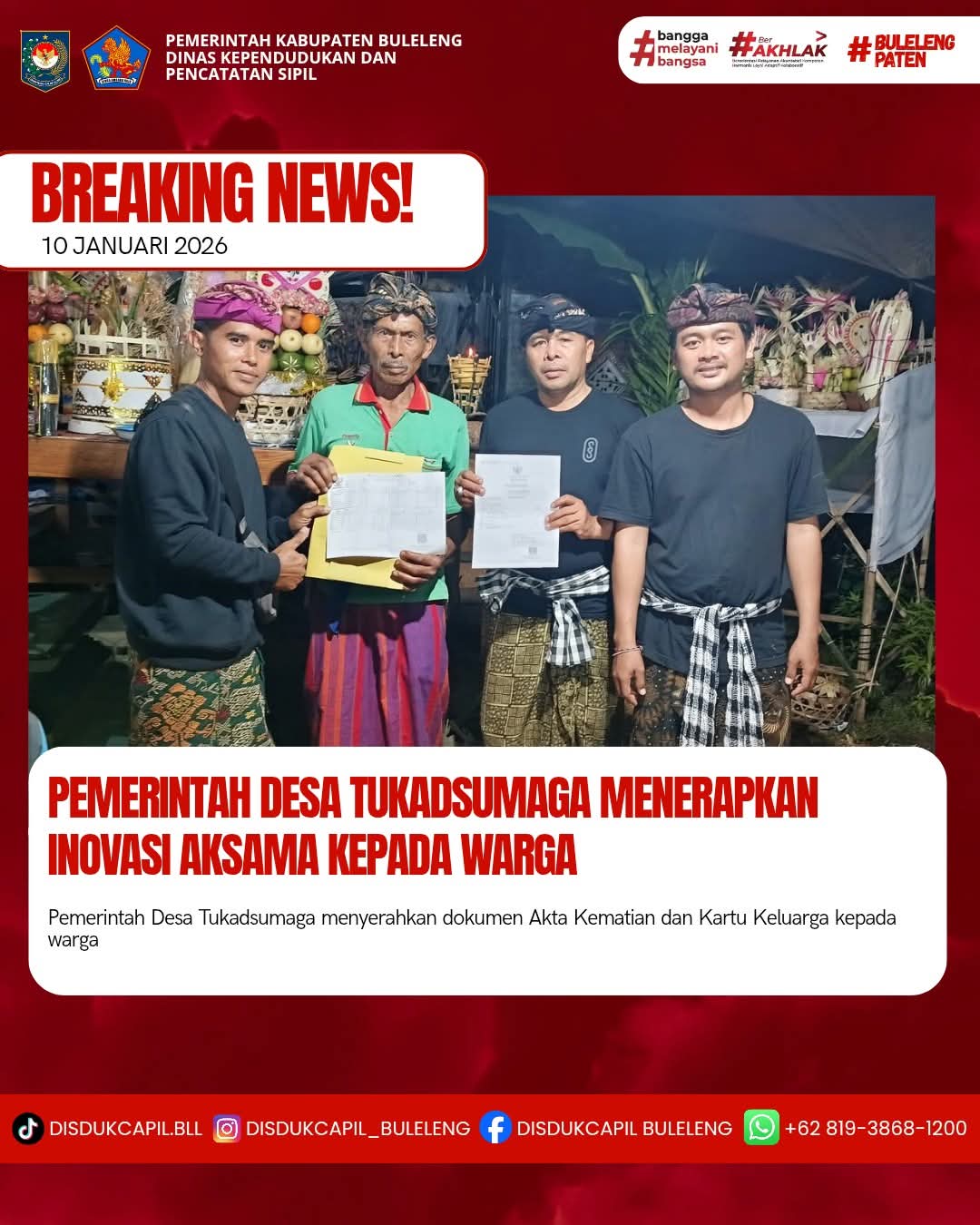 Pemerintah Kabupaten Buleleng melalui Dinas Kependudukan dan Pecatatan Sipil (Disdukcapil) Kabupaten Buleleng memaksimalkan serta mempermudah pelayanan kependudukan masyarakat dengan beberapa inovasi, yakni BALITA (Bayi Lahir Berakta), NYAKSI (Menyerahkan Akta Kawin Saat Acara Perkawinan) dan AKSAMA ( Akta Kematian Diserahkan Saat Masih Berduka) melalui aplikasi Aku Online. Di Desa Tukadsumaga Kecamatan Gerokgak, telah diterapkan program Aksama (Akta Kematian Diserahkan Saat Masih Berduka) yang dilakukan secara langsung oleh Kelian Banjar Dinas Gandongan Ketut Wira Sena dengan menyerahkan Akta Kematian atas nama Ni Nengah Soka dan Kartu Keluarga atas nama I Made Sedana kepada pihak keluarga almarhum di Banjar Dinas Gandongan Desa Tukadusumaga Kecamatan Gerokgak, Sabtu (10/1).