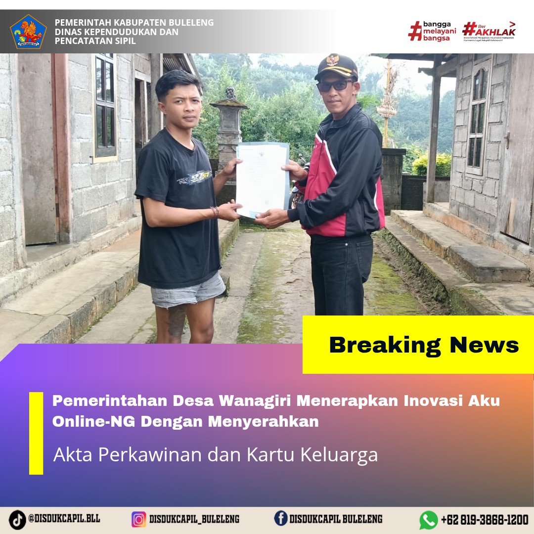 Pemerintah Kabupaten Buleleng melalui Dinas Kependudukan dan Pecatatan Sipil (Disdukcapil) Kabupaten Buleleng memaksimalkan serta mempermudah pelayanan kependudukan masyarakat dengan beberapa inovasi, melalui aplikasi AKU Online-NG. Dimana dalam penerapan aplikasi Aku Online-NG tersebut masyarakat tidak perlu lagi datang ke Dinas Dukcapil untuk melakukan pelayanan langsung cukup dengan datang ke Desa nanti akan dibantu oleh operator Desa masing-masing. Di Desa Wanagiri Kecamatan Sukasada, telah diserahkan dokumen kependudukan berupa Dokumen Akta Perkawinan dan Kartu Keluarga kepada warga Banjar Dinas Bhuanasari oleh Pemerintah Desa Wanagiri di Desa Wanagiri, Senin (22/12).