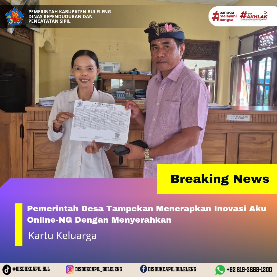 Pemerintah Kabupaten Buleleng melalui Dinas Kependudukan dan Pecatatan Sipil (Disdukcapil) Kabupaten Buleleng memaksimalkan serta mempermudah pelayanan kependudukan masyarakat dengan beberapa inovasi, melalui aplikasi AKU Online-NG. Dimana dalam penerapan aplikasi Aku Online-NG tersebut masyarakat tidak perlu lagi datang ke Dinas Dukcapil untuk melakukan pelayanan langsung cukup dengan datang ke Desa nanti akan dibantu oleh operator Desa masing-masing. Di Desa Tampekan Kecamatan Banjar, telah diserahkan dokumen kependudukan berupa Kartu Keluarga atas nama Kadek Ayu Listiana Dewi warga Desa Tampekan yang diserahkan langsung oleh Pemerintahan Desa Tampekan, Rabu (20/8).