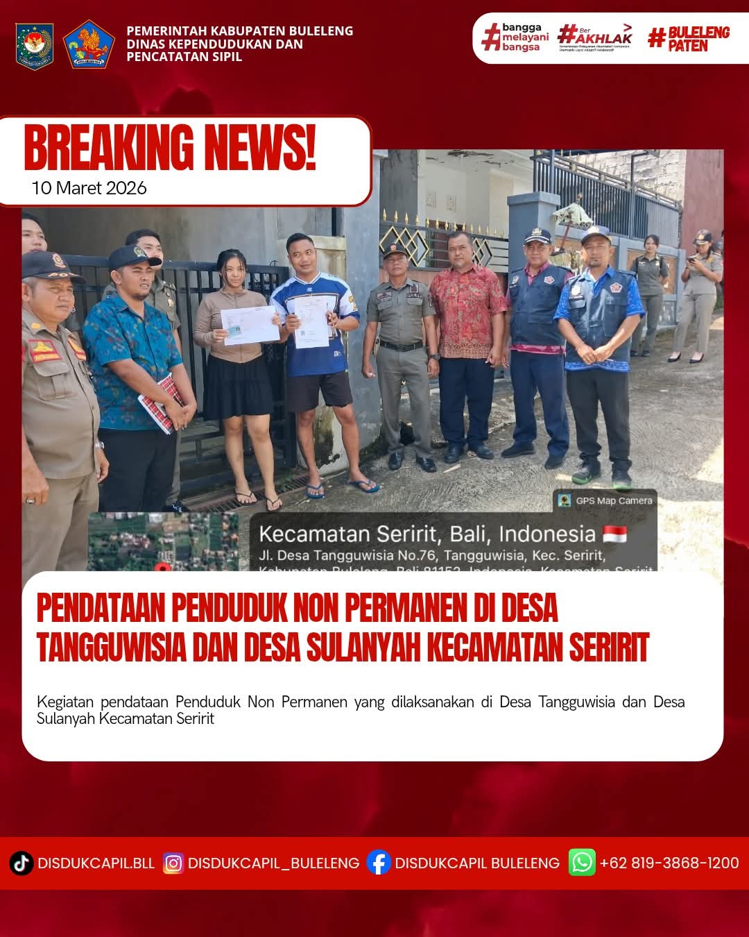 Kali ini Selasa, 10 Maret 2026, Dinas Kependudukan dan Pencatatan Sipil Kabupaten Buleleng melaksanakan kegiatan pendataan penduduk Non Permanen di Desa Tangguwisia Dan Desa Sulanyah Kecamatan Seririt. Dari pendataan penduduk kali ini didapatkan hasil :
