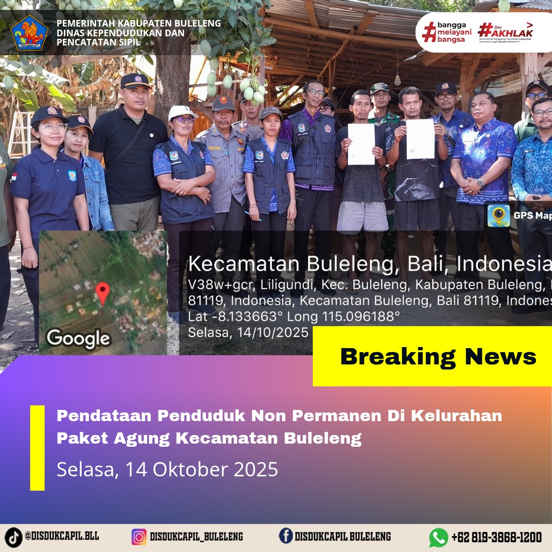 Kali ini Selasa, 14 Oktober 2025, Dinas Kependudukan dan Pencatatan Sipil Kabupaten Buleleng melaksanakan kegiatan pendataan penduduk Non Permanen di Kelurahan Paket Agung Kecamatan Buleleng. Dari pendataan penduduk kali ini didapatkan hasil :