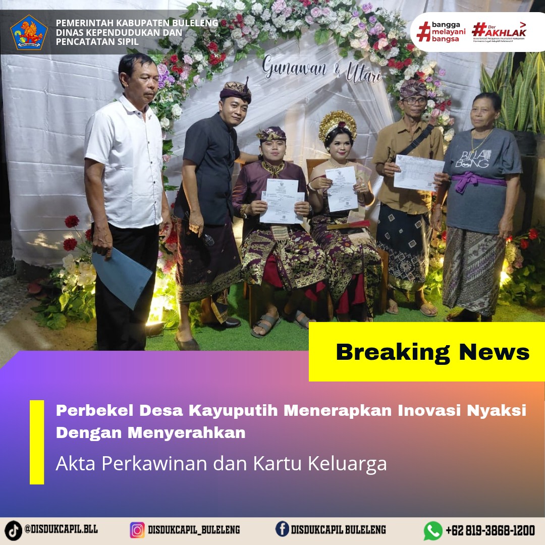 Pemerintah Kabupaten Buleleng melalui Dinas Kependudukan dan Pecatatan Sipil (Disdukcapil) Kabupaten Buleleng memaksimalkan serta mempermudah pelayanan kependudukan masyarakat dengan beberapa inovasi, yakni BALITA (Bayi Lahir Berakta), NYAKSI (Menyerahkan Akta Kawin Saat Acara Perkawinan) dan AKSAMA ( Akta Kematian Diserahkan Saat Masih Berduka) melalui aplikasi Aku Online-NG. Di Desa Kayuputih Kecamatan Sukasada, telah diterapkan program NYAKSI (Menyerahkan Akta Perkawinan Saat Acara Perkawinan) yang dilakukan secara langsung oleh Perbekel Desa Kayuputih Gede Gelgel Ariawan dengan menyerahkan Akta Perkawinan dan Kartu Keluarga kepada kedua mempelai atas nama Komang Gunawan dan Komang Sri Utari dan masing-masing orang tua mempelai, Sabtu (18/10).