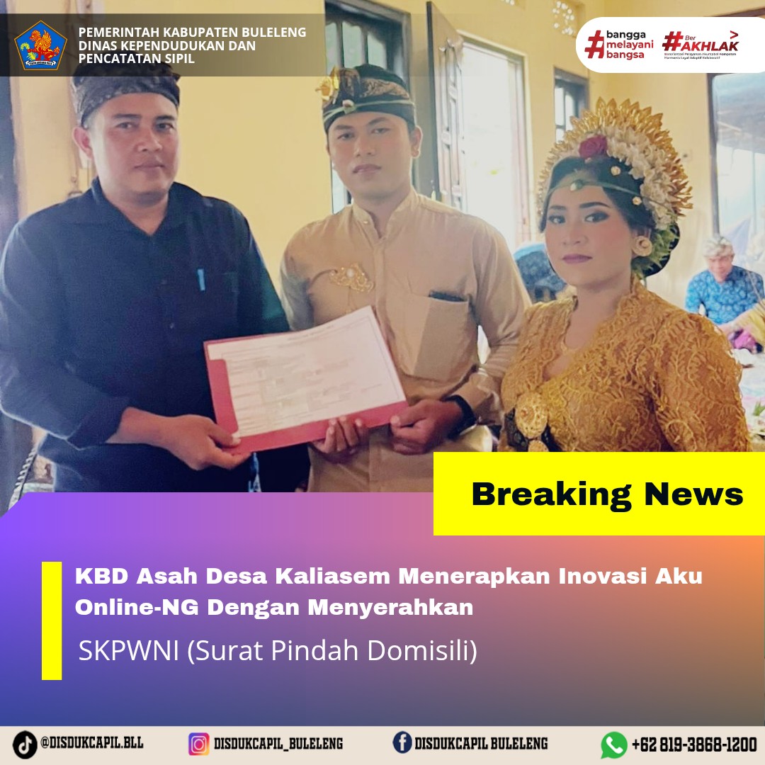 Pemerintah Kabupaten Buleleng melalui Dinas Kependudukan dan Pecatatan Sipil (Disdukcapil) Kabupaten Buleleng memaksimalkan serta mempermudah pelayanan kependudukan masyarakat dengan beberapa inovasi, melalui aplikasi AKU Online. Dimana dalam penerapan aplikasi Aku Online tersebut masyarakat tidak perlu lagi datang ke Dinas Dukcapil untuk melakukan pelayanan langsung cukup dengan datang ke Desa nanti akan dibantu oleh operator Desa masing-masing. Di Desa Kaliasem Kecamatan Banjar telah diserahkan dokumen kependudukan berupa SKPWNI antar Kecamatan atas nama Komang Mariani yang diserahkan oleh Kelian Banjar Dinas Asah Desa Kaliasem Kecamatan Banjar, Senin (29/9).