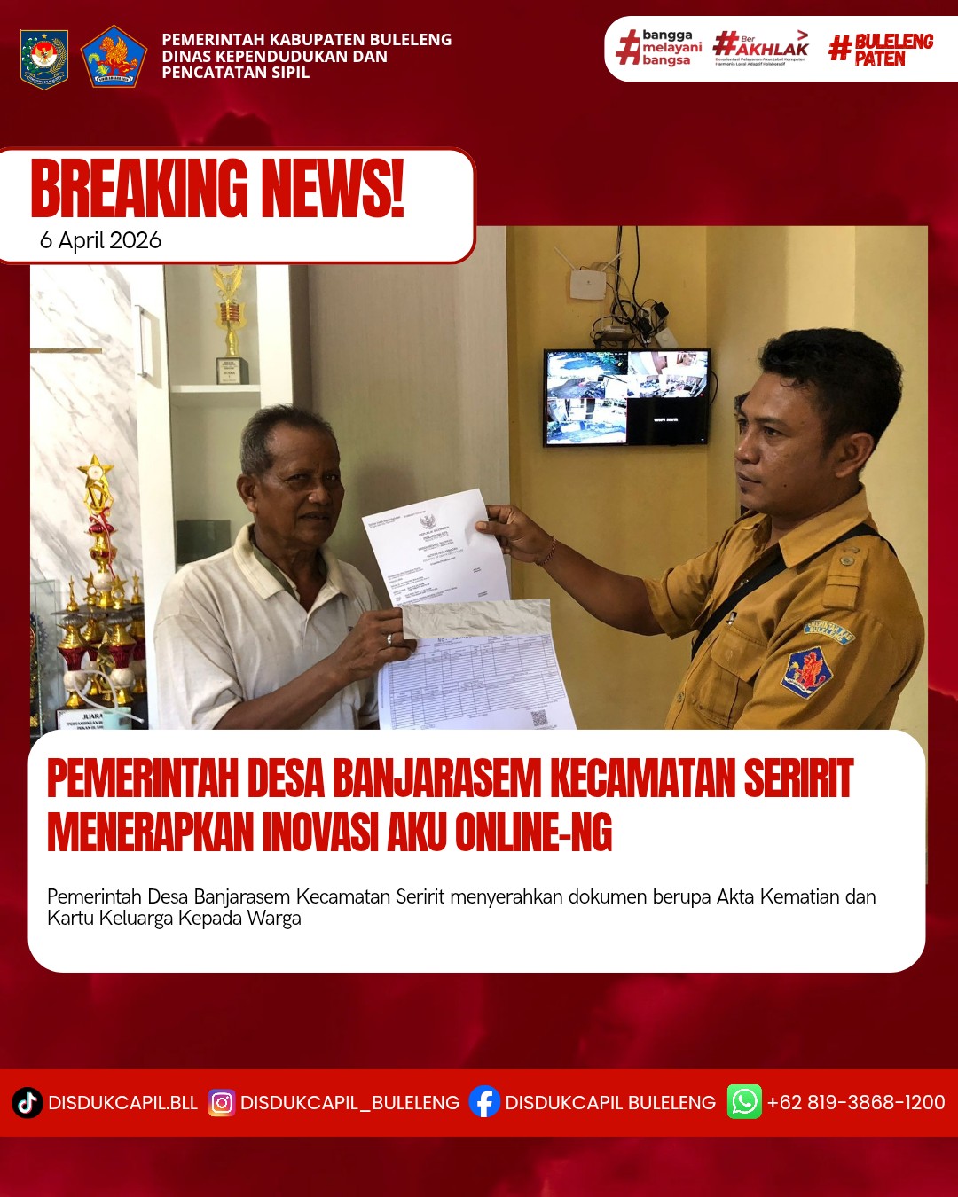 Pemerintah Kabupaten Buleleng melalui Dinas Kependudukan dan Pecatatan Sipil (Disdukcapil) Kabupaten Buleleng memaksimalkan serta mempermudah pelayanan kependudukan masyarakat dengan beberapa inovasi, melalui aplikasi AKU Online-NG. Dimana dalam penerapan aplikasi Aku Online-NG tersebut masyarakat tidak perlu lagi datang ke Dinas Dukcapil untuk melakukan pelayanan langsung, cukup dengan datang ke Desa nanti akan dibantu oleh operator Desa masing-masing. Di Desa Banjarasem Kecamatan Seririt, telah diserahkan dokumen kependudukan berupa Akta Kematian atas nama Ketut Ajeng dan Kartu Keluarga atas nama Komang Sayuning yang diserahkan langsung oleh Kasi Pemerintahan, Desa Banjarasem, Kecamatan Seririt Senin (6/4).