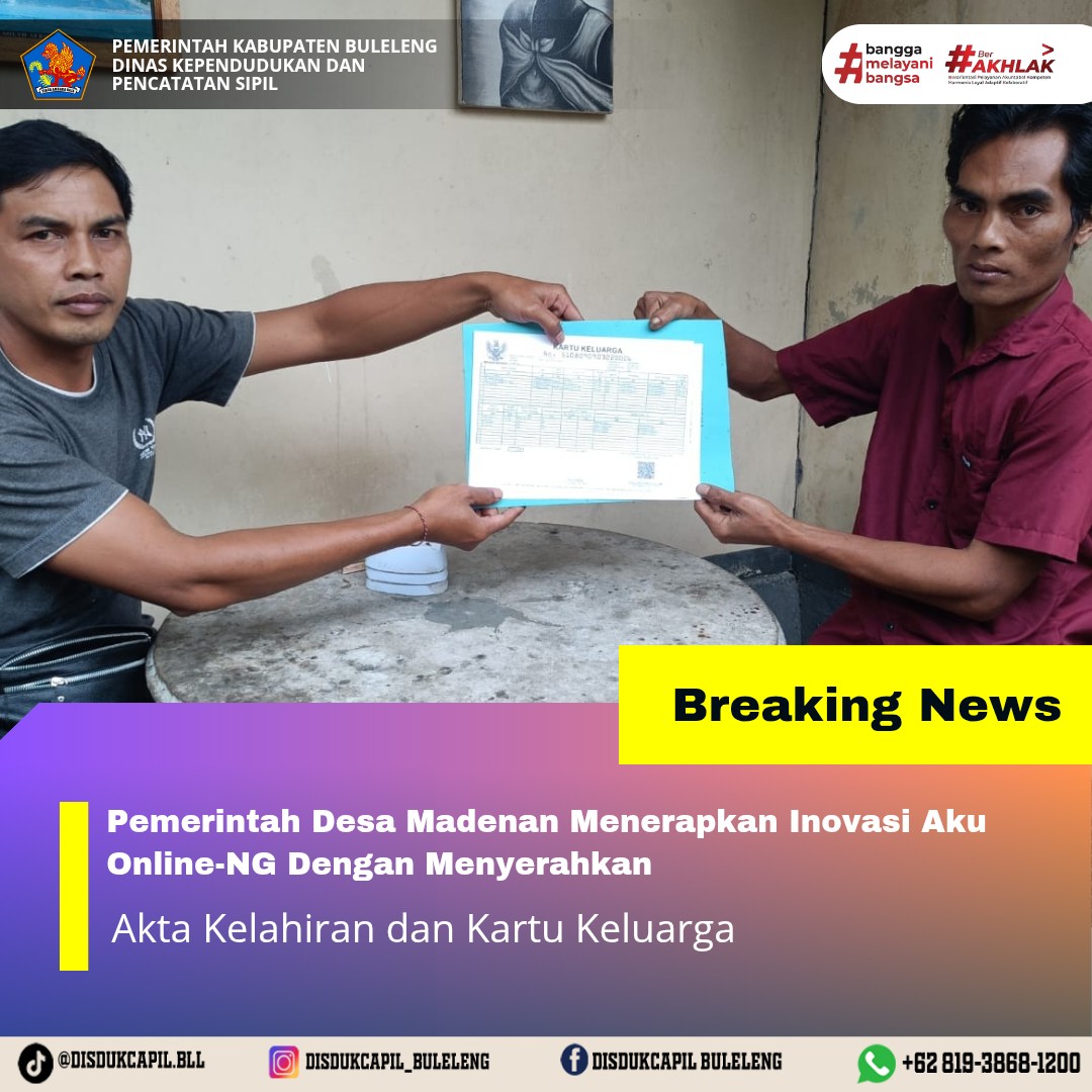 Pemerintah Kabupaten Buleleng melalui Dinas Kependudukan dan Pecatatan Sipil (Disdukcapil) Kabupaten Buleleng memaksimalkan serta mempermudah pelayanan kependudukan masyarakat dengan beberapa inovasi, melalui aplikasi AKU Online-NG. Dimana dalam penerapan aplikasi Aku Online-NG tersebut masyarakat tidak perlu lagi datang ke Dinas Dukcapil untuk melakukan pelayanan langsung cukup dengan datang ke Desa nanti akan dibantu oleh operator Desa masing-masing. Di Desa Madenan Kecamatan Tejakula, telah diserahkan dokumen kependudukan berupa Akta Kelahiran atas nama LUH SRIASIH dan Kartu Keluarga atas nama KETUT DIARSA yang diserahkan langsung oleh Kelian Banjar Dinas Keduran, Desa Madenan Kecamatan Tejakula, Kabupaten Buleleng, Senin (24/11).
