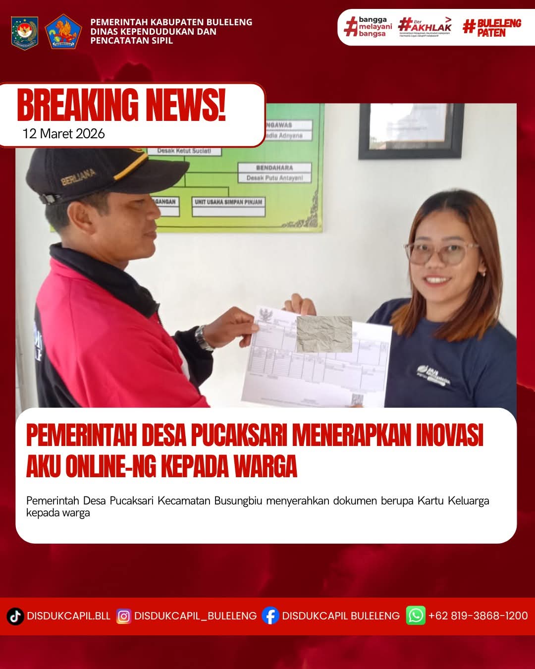 Pemerintah Kabupaten Buleleng melalui Dinas Kependudukan dan Pecatatan Sipil (Disdukcapil) Kabupaten Buleleng memaksimalkan serta mempermudah pelayanan kependudukan masyarakat dengan beberapa inovasi, melalui aplikasi AKU Online-NG. Dimana dalam penerapan aplikasi Aku Online-NG tersebut masyarakat tidak perlu lagi datang ke Dinas Dukcapil untuk melakukan pelayanan langsung cukup dengan datang ke Desa nanti akan dibantu oleh operator Desa masing-masing. Di Desa Pucaksari Kecamatan Busungbiu, telah diserahkan dokumen kependudukan berupa Kartu Keluarga atas nama Gede Yuliarta yang diserahkan langsung oleh Kelian Banjar Dinas Beteng Desa Pucaksari, Kamis (12/3).