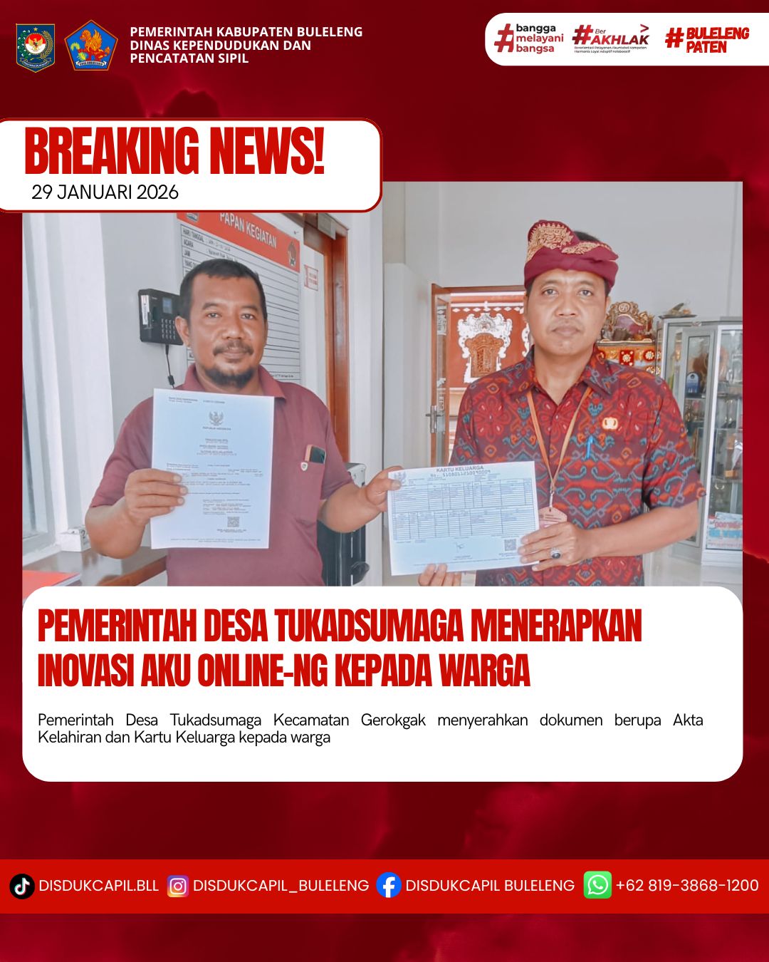 Pemerintah Kabupaten Buleleng melalui Dinas Kependudukan dan Pecatatan Sipil (Disdukcapil) Kabupaten Buleleng memaksimalkan serta mempermudah pelayanan kependudukan masyarakat dengan beberapa inovasi, melalui aplikasi AKU Online-NG. Dimana dalam penerapan aplikasi Aku Online-NG tersebut masyarakat tidak perlu lagi datang ke Dinas Dukcapil untuk melakukan pelayanan langsung cukup dengan datang ke Desa nanti akan dibantu oleh operator Desa masing-masing. Di Desa Tukadsumaga Kecamatan Gerokgak, telah diserahkan dokumen kependudukan berupa Akta Kelahiran dan Kartu Keluarga atas nama I KADEK SUARDANA warga Desa Tukadsumaga yang diserahkan oleh Kelian Banjar Dinas Yehmas di Desa Tukadsumaga, Kamis (29/1).