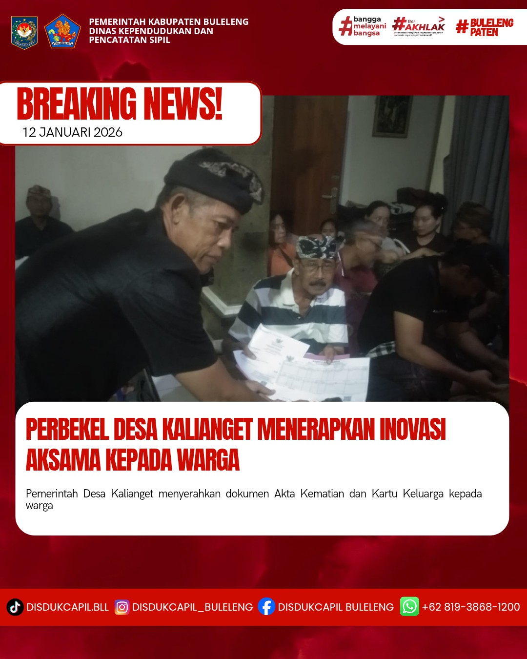 Pemerintah Kabupaten Buleleng melalui Dinas Kependudukan dan Pecatatan Sipil (Disdukcapil) Kabupaten Buleleng memaksimalkan serta mempermudah pelayanan kependudukan masyarakat dengan beberapa inovasi, yakni BALITA (Bayi Lahir Berakta), NYAKSI (Menyerahkan Akta Kawin Saat Acara Perkawinan) dan AKSAMA ( Akta Kematian Diserahkan Saat Masih Berduka) melalui aplikasi Aku Online-NG. Di Desa Kalianget Kecamatan Seririt, telah diterapkan program Aksama (Akta Kematian Diserahkan Saat Masih Berduka) yang dilakukan secara langsung oleh Perbekel Desa Kalianget Ketut Nanda Kusuma dengan menyerahkan Akta Kematian dan Kartu Keluarga warga Dusun Kelodan Desa Kalianget, Minggu (11/1).