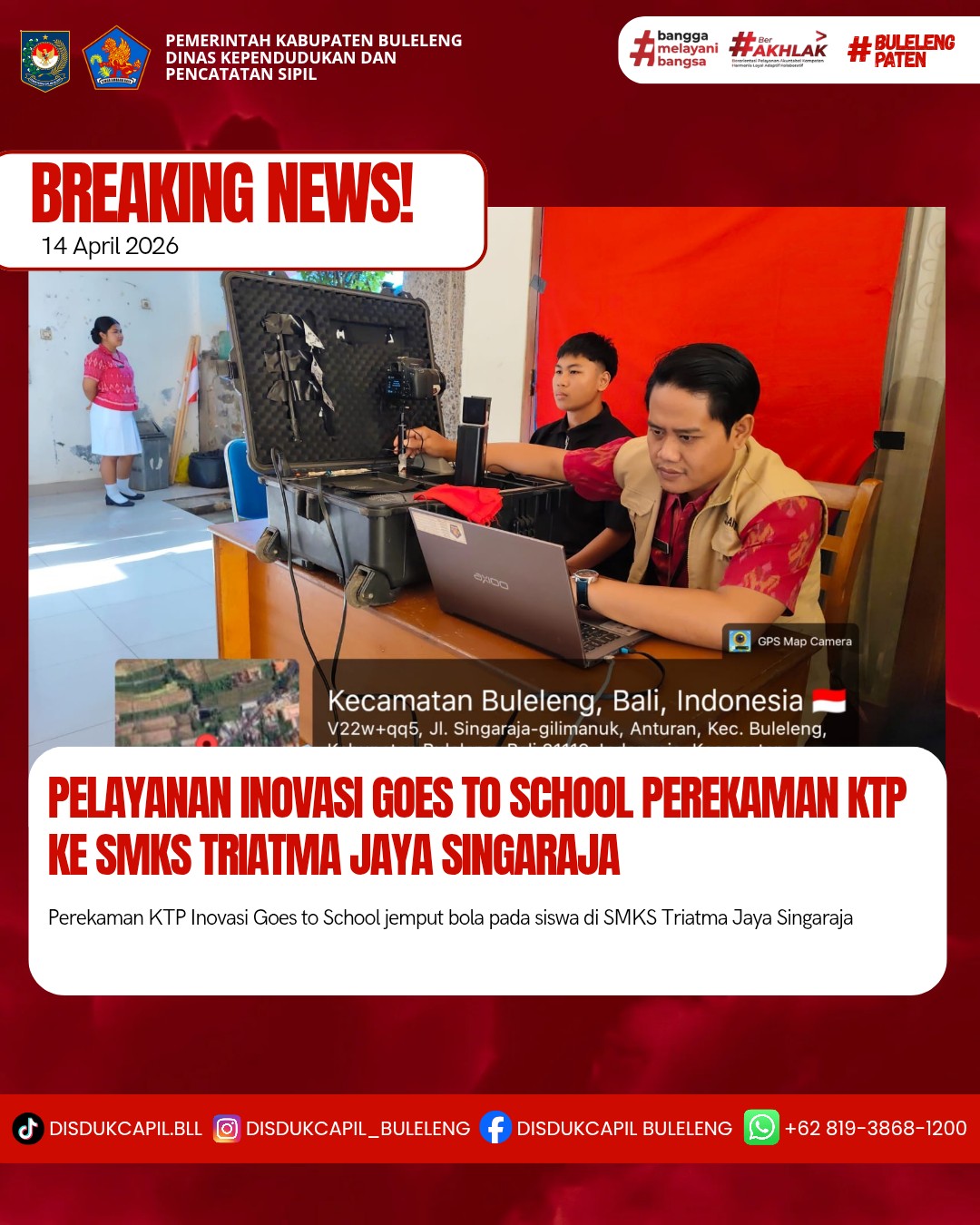 Pada kali ini Selasa, 14 April 2026 pelayanan perekaman KTP-el dilaksanakan di SMKS Triatma Jaya Singaraja. Hasil perekaman di SMKS Triatma Jaya Singaraja dengan data BNBA sebanyak 113 orang dan total yang melakukan perekaman sebanyak 40 orang, dimana hasil perekaman data di dalam BNBA sebanyak 40 orang dan tidak ada data diluar BNBA yang melakukan perekaman. Dilihat dari hasil sisa data BNBA yang belum merekam sebanyak 73 orang keterangan dari pihak sekolah sisa BNBA yang belum perekaman masing magang.