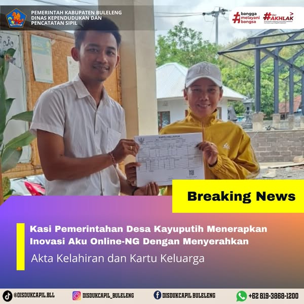 Pemerintah Kabupaten Buleleng melalui Dinas Kependudukan dan Pecatatan Sipil (Disdukcapil) Kabupaten Buleleng memaksimalkan serta mempermudah pelayanan kependudukan masyarakat dengan beberapa inovasi, melalui aplikasi AKU Online-NG. Dimana dalam penerapan aplikasi Aku Online-NG tersebut masyarakat tidak perlu lagi datang ke Dinas Dukcapil untuk melakukan pelayanan langsung cukup dengan datang ke Desa nanti akan dibantu oleh operator Desa masing-masing. Di Desa Kayuputih Kecamatan Sukasada, telah diserahkan dokumen kependudukan berupa Akta Kelahiran atas nama Made Darma dan Luh Mawa dan Kartu Keluarga atas nama Made Darma yang diserahkan langsung oleh Kasi Pemerintahan Desa Kayuputih Kecamatan Sukasada bertempat di kantor Perbekel Desa Kayuputih, Kecamatan Sukasada, Kabupaten Buleleng, Rabu (17/9).
