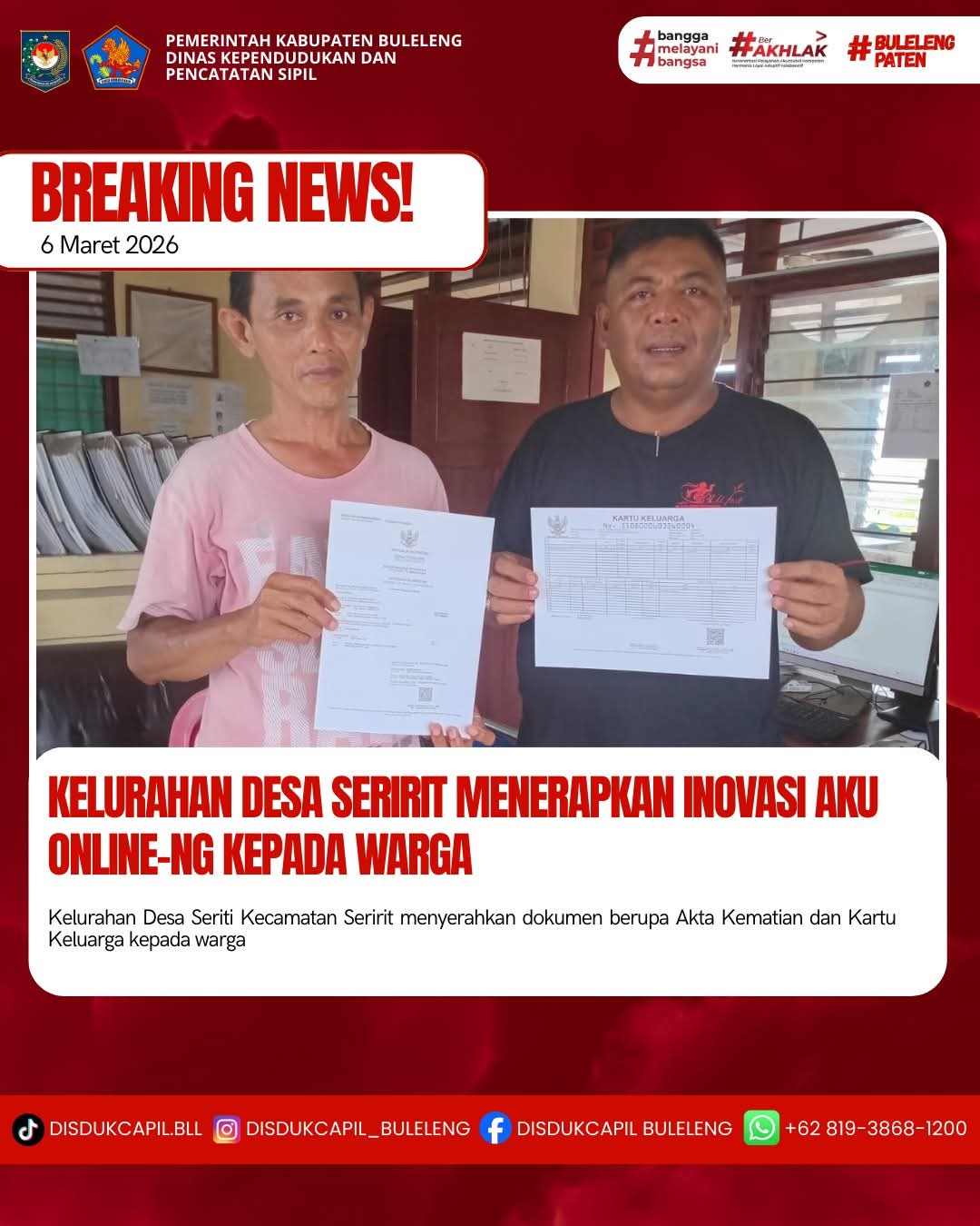 Pemerintah Kabupaten Buleleng melalui Dinas Kependudukan dan Pecatatan Sipil (Disdukcapil) Kabupaten Buleleng memaksimalkan serta mempermudah pelayanan kependudukan masyarakat dengan beberapa inovasi, melalui aplikasi AKU Online-NG. Dimana dalam penerapan aplikasi Aku Online-NG tersebut masyarakat tidak perlu lagi datang ke Dinas Dukcapil untuk melakukan pelayanan langsung cukup dengan datang ke Desa nanti akan dibantu oleh operator Desa masing-masing. Di Kelurahan Seririt Kecamatan Seririt, telah diserahkan dokumen kependudukan berupa Akta Kematian atas nama Nyoman Setiaja dan Kartu Keluarga Keluarga atas nama Gede Tusan Putra Jaya yang diserahkan langsung oleh Lurah Seririt Putu Sugiarto, S.Sos,. M.AP., di Kecamatan Seririt, Kabupaten Buleleng, Jumat (6/3).