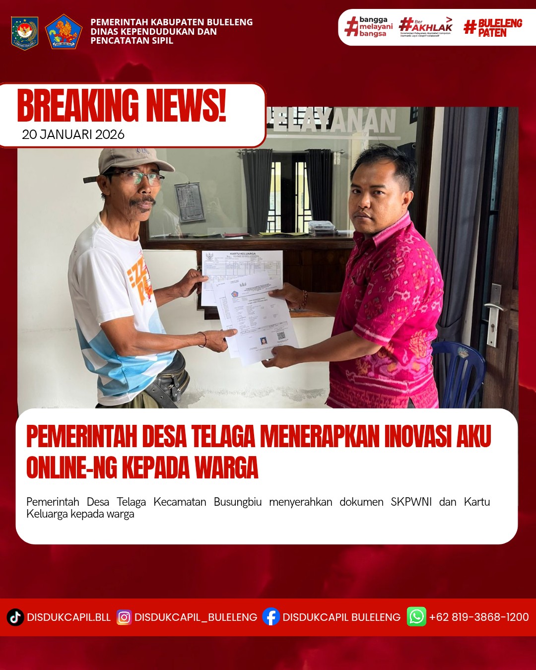 Pemerintah Kabupaten Buleleng melalui Dinas Kependudukan dan Pecatatan Sipil (Disdukcapil) Kabupaten Buleleng memaksimalkan serta mempermudah pelayanan kependudukan masyarakat dengan beberapa inovasi, melalui aplikasi AKU Online-NG. Dimana dalam penerapan aplikasi Aku Online-NG tersebut masyarakat tidak perlu lagi datang ke Dinas Dukcapil untuk melakukan pelayanan langsung cukup dengan datang ke Desa nanti akan dibantu oleh operator Desa masing-masing. Di Desa Telaga Kecamatan Busungbiu, telah diserahkan dokumen kependudukan berupa SKPWNI atas nama Ni Luh Widiantari dan Kartu Keluarga atas nama I Wayan Miskin warga Banjar Dinas Kumuda Loka Desa Banjar Tegeha yang diserahkan secara langsung oleh Operator Aku Online Desa Telaga, Selasa (20/1).