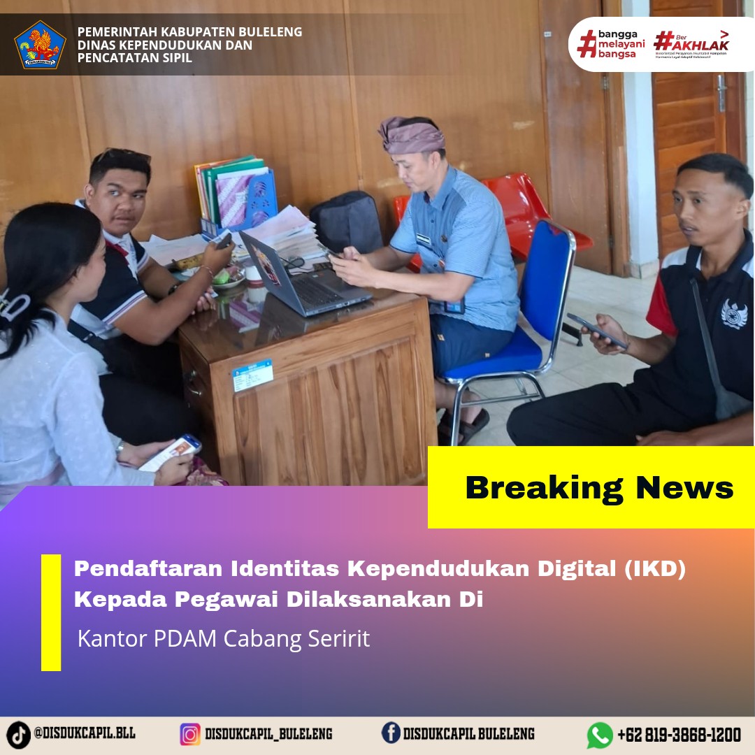 Pelaksanaan pendaftaran Identitas Kependudukan Digital dilaksanakan mulai pukul 09.00 Wita. Pendaftaran Identitas Kependudukan Digital dilaksanakan pada HP/Smartphone dengan OS minimal Android Versi 8 dan iOS minimal versi 11 di masing-masing pengguna HP/Smartphone (aplikasi dapat diinstall pada playstore/appstore dengan alamat Identitas Kependudukan Digital). Dari pelaksanaan pendaftaran Identitas Kependudukan Digital di Kantor PDAM Cabang Seririt yaitu teraktivasi IKD sebanyak 9 akun.