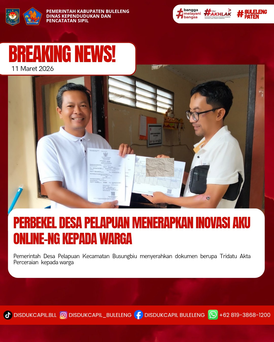 Pemerintah Kabupaten Buleleng melalui Dinas Kependudukan dan Pecatatan Sipil (Disdukcapil) Kabupaten Buleleng memaksimalkan serta mempermudah pelayanan kependudukan masyarakat dengan beberapa inovasi, melalui aplikasi AKU Online-NG. Dimana dalam penerapan aplikasi Aku Online-NG tersebut masyarakat tidak perlu lagi datang ke Dinas Dukcapil untuk melakukan pelayanan langsung cukup dengan datang ke Desa nanti akan dibantu oleh operator Desa masing-masing. Di Desa Pelapuan Kecamatan Busungbiu, telah diserahkan dokumen kependudukan berupa Kartu Keluarga atas nama Komang Aris Cahyani dan Kartu Keluarga atas nama Ketut Agus Alit Sanjaya, Akta Perceraian atas nama Komang Aris Cahyani dan Ketut Agus Alit Sanjaya yang diserahkan oleh Perbekel Desa Pelapuan GEDE AGUS ARMIKA YASA bertempat di Kantor Perbekel Desa Pelapuan, Kecamatan Busungbiu, Kabupaten Buleleng, Rabu (11/3).