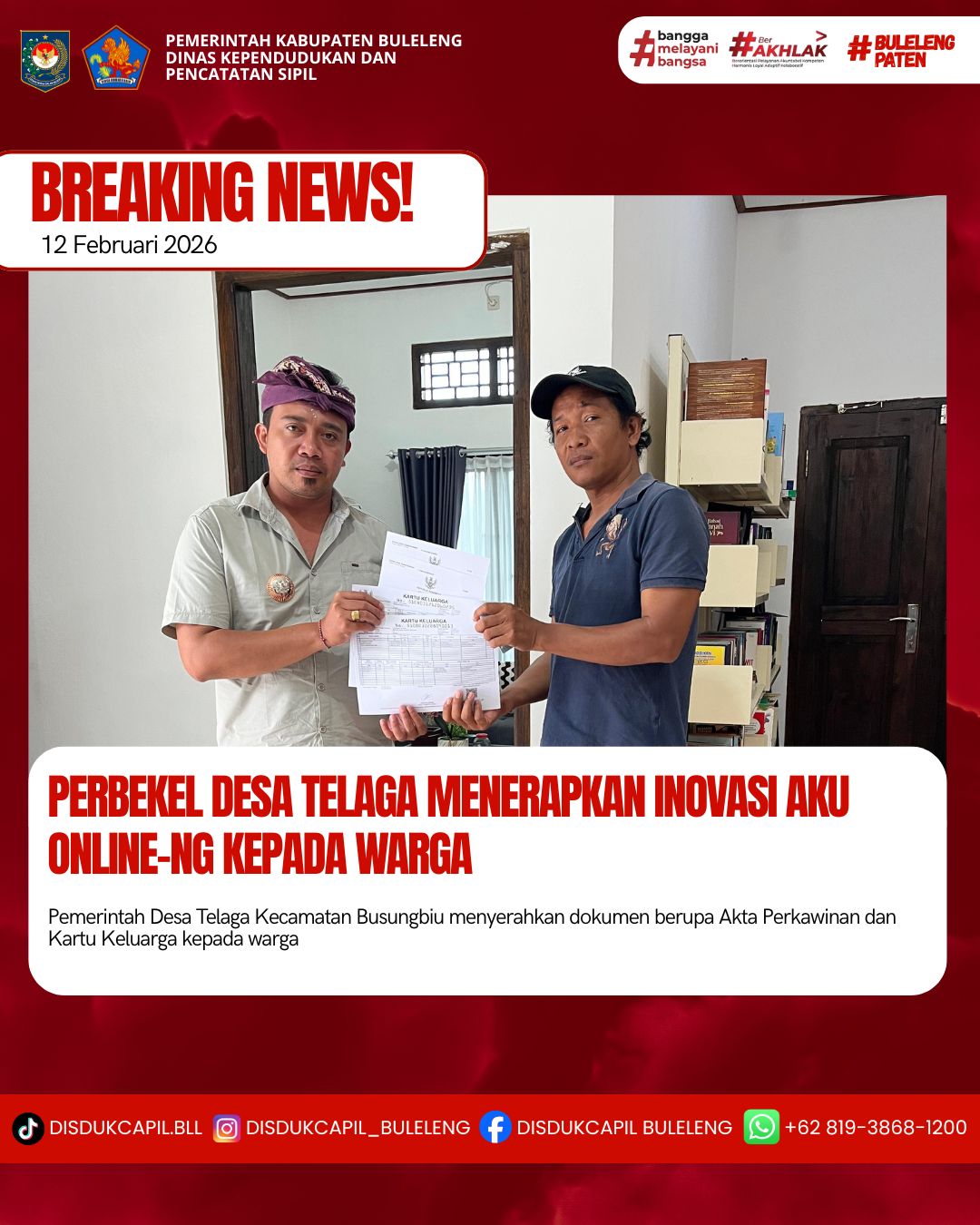Pemerintah Kabupaten Buleleng melalui Dinas Kependudukan dan Pecatatan Sipil (Disdukcapil) Kabupaten Buleleng memaksimalkan serta mempermudah pelayanan kependudukan masyarakat dengan beberapa inovasi, melalui aplikasi AKU Online-NG. Dimana dalam penerapan aplikasi Aku Online-NG tersebut masyarakat tidak perlu lagi datang ke Dinas Dukcapil untuk melakukan pelayanan langsung cukup dengan datang ke Desa nanti akan dibantu oleh operator Desa masing-masing. Di Desa Telaga Kecamatan Busungbiu, telah diserahkan dokumen kependudukan berupa Akta Perkawinan atas nama I Komang Antoni dengan Kadek Galung dan Kartu Keluarga atas nama I Komang Antoni berserta KTP asli I Komang Antoni dengan Kadek Galung yang diserahkan langsung oleh Perbekel Desa Telaga MADE HENDRA MAHAYUDA,S.PD bertempat di Kantor Perbekel Desa Telaga, Kecamatan Busungbi, Kabupaten Buleleng, Kamis (12/2).