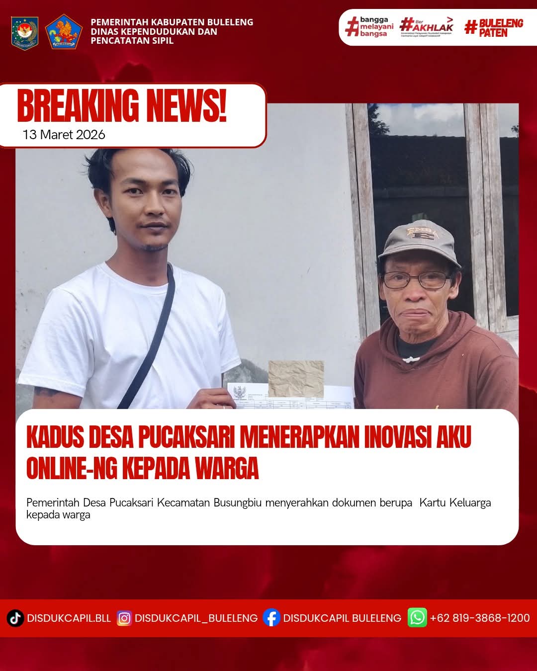 Pemerintah Kabupaten Buleleng melalui Dinas Kependudukan dan Pecatatan Sipil (Disdukcapil) Kabupaten Buleleng memaksimalkan serta mempermudah pelayanan kependudukan masyarakat dengan beberapa inovasi, melalui aplikasi AKU Online-NG. Dimana dalam penerapan aplikasi Aku Online-NG tersebut masyarakat tidak perlu lagi datang ke Dinas Dukcapil untuk melakukan pelayanan langsung cukup dengan datang ke Desa nanti akan dibantu oleh operator Desa masing-masing. Di Desa Pucaksari Kecamatan Busungbiu, telah diserahkan dokumen kependudukan berupa Kartu Keluarga atas nama Putu Sweden yang diserahkan langsung oleh Kadus Banjar Tegallasih Desa Pucaksari, Jumat (13/3).