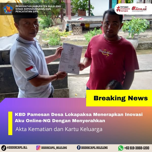 Pemerintah Kabupaten Buleleng melalui Dinas Kependudukan dan Pecatatan Sipil (Disdukcapil) Kabupaten Buleleng memaksimalkan serta mempermudah pelayanan kependudukan masyarakat dengan beberapa inovasi, melalui aplikasi AKU Online. Dimana dalam penerapan aplikasi Aku Online tersebut masyarakat tidak perlu lagi datang ke Dinas Dukcapil untuk melakukan pelayanan langsung cukup dengan datang ke Desa nanti akan dibantu oleh operator Desa masing-masing. Di Desa Lokapaksa Kecamatan Seririt telah diserahkan dokumen kependudukan berupa Akta Kematian dan Kartu Keluarga oleh Kelian Banjar Dinas Pamesan Desa Lokapaksa Kecamatan Seririt, Kamis (21/8).