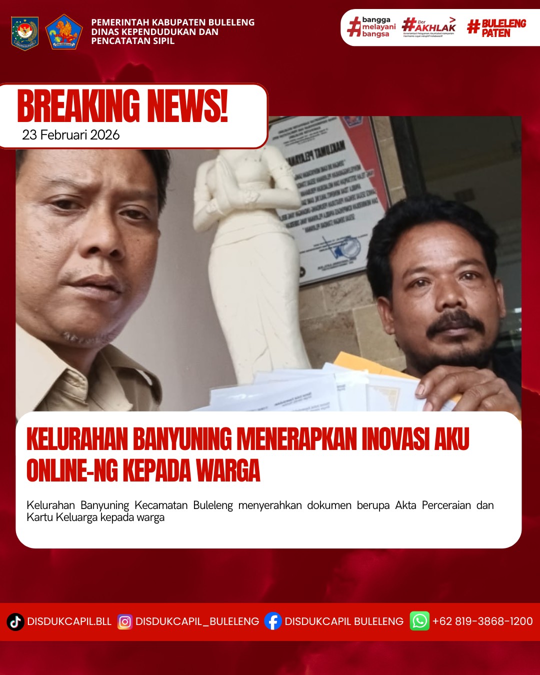 Pemerintah Kabupaten Buleleng melalui Dinas Kependudukan dan Pecatatan Sipil (Disdukcapil) Kabupaten Buleleng memaksimalkan serta mempermudah pelayanan kependudukan masyarakat dengan beberapa inovasi, melalui aplikasi AKU Online-NG. Dimana dalam penerapan aplikasi Aku Online-NG tersebut masyarakat tidak perlu lagi datang ke Dinas Dukcapil untuk melakukan pelayanan langsung cukup dengan datang ke Desa nanti akan dibantu oleh operator Desa masing-masing. Di Kelurahan Banyuning Kecamatan Buleleng, telah diserahkan dokumen kependudukan berupa Akta Perceraian dan Kartu Keluarga atas nama Ketut Suarsana warga Kelurahan Banyuning yang diserahkan langsung oleh Kelurahan Banyuning Kecamatan Buleleng, Kabupaten Buleleng, Senin (23/2).