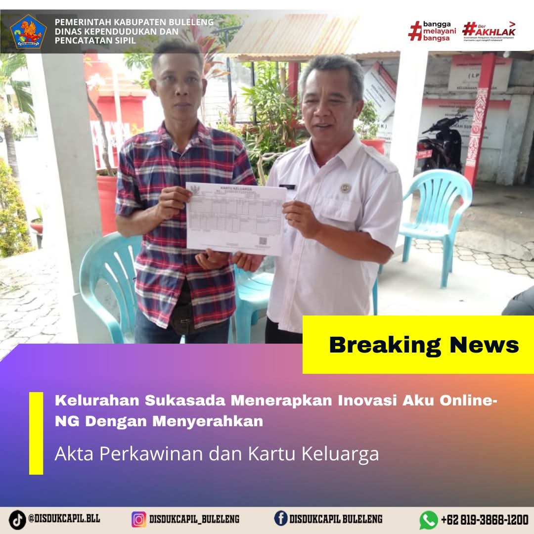 Pemerintah Kabupaten Buleleng melalui Dinas Kependudukan dan Pecatatan Sipil (Disdukcapil) Kabupaten Buleleng memaksimalkan serta mempermudah pelayanan kependudukan masyarakat dengan beberapa inovasi, melalui aplikasi AKU Online-NG. Dimana dalam penerapan aplikasi Aku Online-NG tersebut masyarakat tidak perlu lagi datang ke Dinas Dukcapil untuk melakukan pelayanan langsung cukup dengan datang ke Desa nanti akan dibantu oleh operator Desa masing-masing. Di Kelurahan Sukasada Kecamatan Sukasada, telah diserahkan dokumen kependudukan berupa Akta Perkawinan dan Kartu Keluarga yang diserahkan secara langsung oleh Kasi Pembangunan dan Sosial Kelurahan Sukasada Kecamatan Sukasada Kepada warga Lingkungan Bakung Kadek Ariawan , Rabu (3/12).