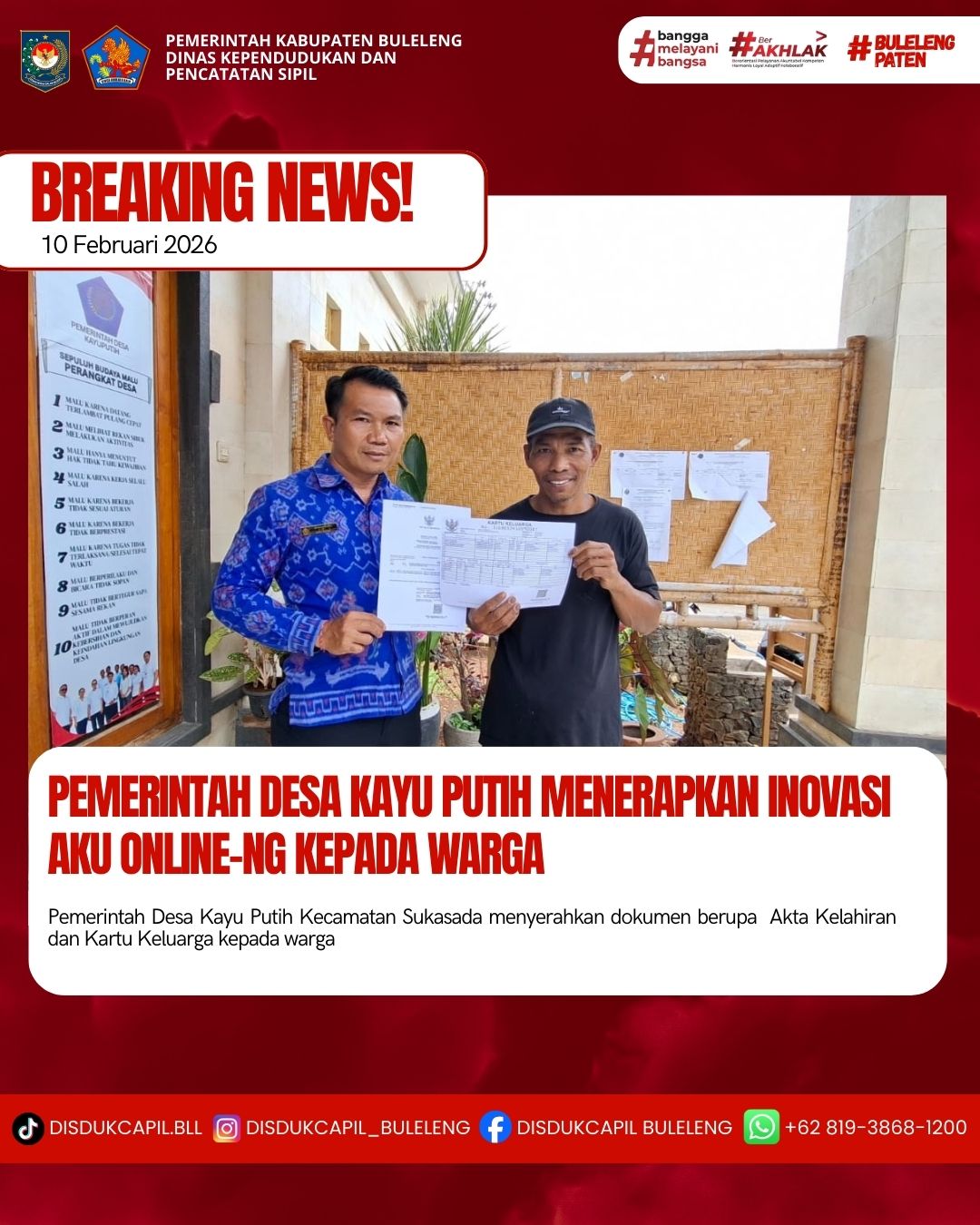 Pemerintah Kabupaten Buleleng melalui Dinas Kependudukan dan Pecatatan Sipil (Disdukcapil) Kabupaten Buleleng memaksimalkan serta mempermudah pelayanan kependudukan masyarakat dengan beberapa inovasi, melalui aplikasi AKU Online-NG. Dimana dalam penerapan aplikasi Aku Online-NG tersebut masyarakat tidak perlu lagi datang ke Dinas Dukcapil untuk melakukan pelayanan langsung cukup dengan datang ke Desa nanti akan dibantu oleh operator Desa masing-masing. Di Desa Kayu Putih Kecamatan Sukasada, telah diserahkan dokumen kependudukan berupa Akta Kelahiran dan Kartu Keluarga atas nama Ketut Sukanata warga Banjar Dinas Bhuanasari, Desa Kayu Putih, Kecamatan Sukasada yang diserahkan secara langsung oleh Kasi Pemerintahan Desa Kayu Putih Kecamatan Sukasada, Selasa (10/2).