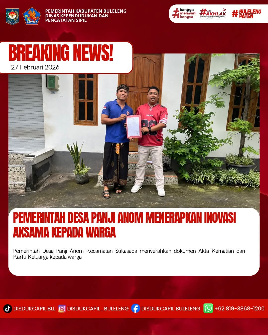 Pemerintah Kabupaten Buleleng melalui Dinas Kependudukan dan Pecatatan Sipil (Disdukcapil) Kabupaten Buleleng memaksimalkan serta mempermudah pelayanan kependudukan masyarakat dengan beberapa inovasi, yakni BALITA (Bayi Lahir Berakta), NYAKSI (Menyerahkan Akta Kawin Saat Acara Perkawinan) dan AKSAMA ( Akta Kematian Diserahkan Saat Masih Berduka) melalui aplikasi Aku Online-NG. Di Desa Panji Anom Kecamatan Sukasada, telah diterapkan program Aksama (Akta Kematian Diserahkan Saat Masih Berduka) yang dilakukan secara langsung oleh Kelian Banjar Dinas Batupulu Desa Panji Anom dengan menyerahkan Akta Kematian atas nama Ketut Jingga dan Kartu Keluarga kepada keluarga almarhum di Banjar Dinas Batupulu, Desa Panji Anom, Kecamatan Sukasada, Jumat (27/2).