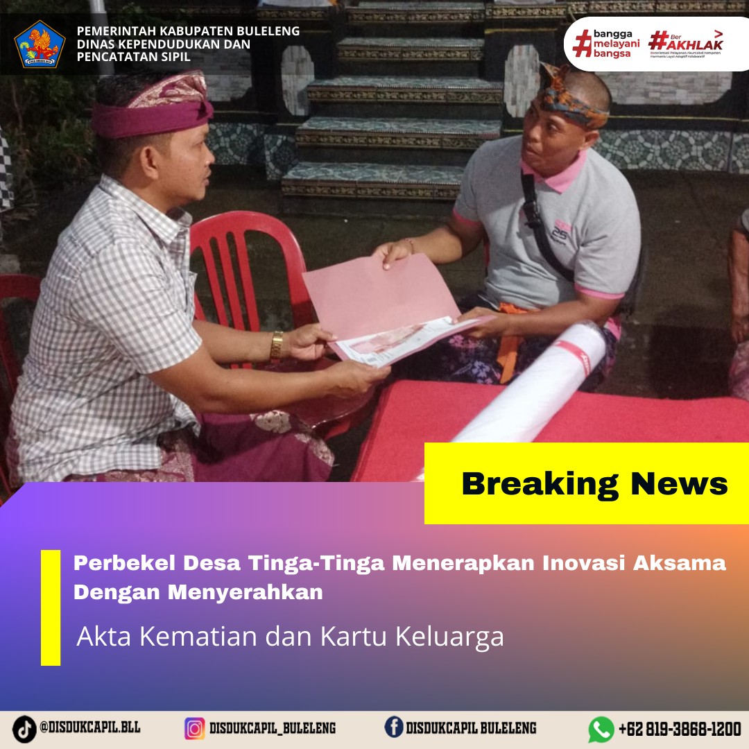 Pemerintah Kabupaten Buleleng melalui Dinas Kependudukan dan Pecatatan Sipil (Disdukcapil) Kabupaten Buleleng memaksimalkan serta mempermudah pelayanan kependudukan masyarakat dengan beberapa inovasi, yakni BALITA (Bayi Lahir Berakta), NYAKSI (Menyerahkan Akta Kawin Saat Acara Perkawinan) dan AKSAMA ( Akta Kematian Diserahkan Saat Masih Berduka) melalui aplikasi Aku Online. Di Desa Tinga-Tinga Kecamatan Gerokgak, telah diterapkan program Aksama (Akta Kematian Diserahkan Saat Masih Berduka) yang dilakukan secara langsung oleh Perbekel Desa Tinga-Tinga I Komang Adi Wirawan didampingi Kadus Juntal Made Buderana dengan menyerahkan Akta Kematian atas nama I Gusti Ayu Purnami dan Kartu Keluarga dikediaman rumah duka yang berlokasi di Banjar Dinas Juntal, Desa Tinga-Tinga, Kecamatan Gerokgak, Sabtu (27/12).