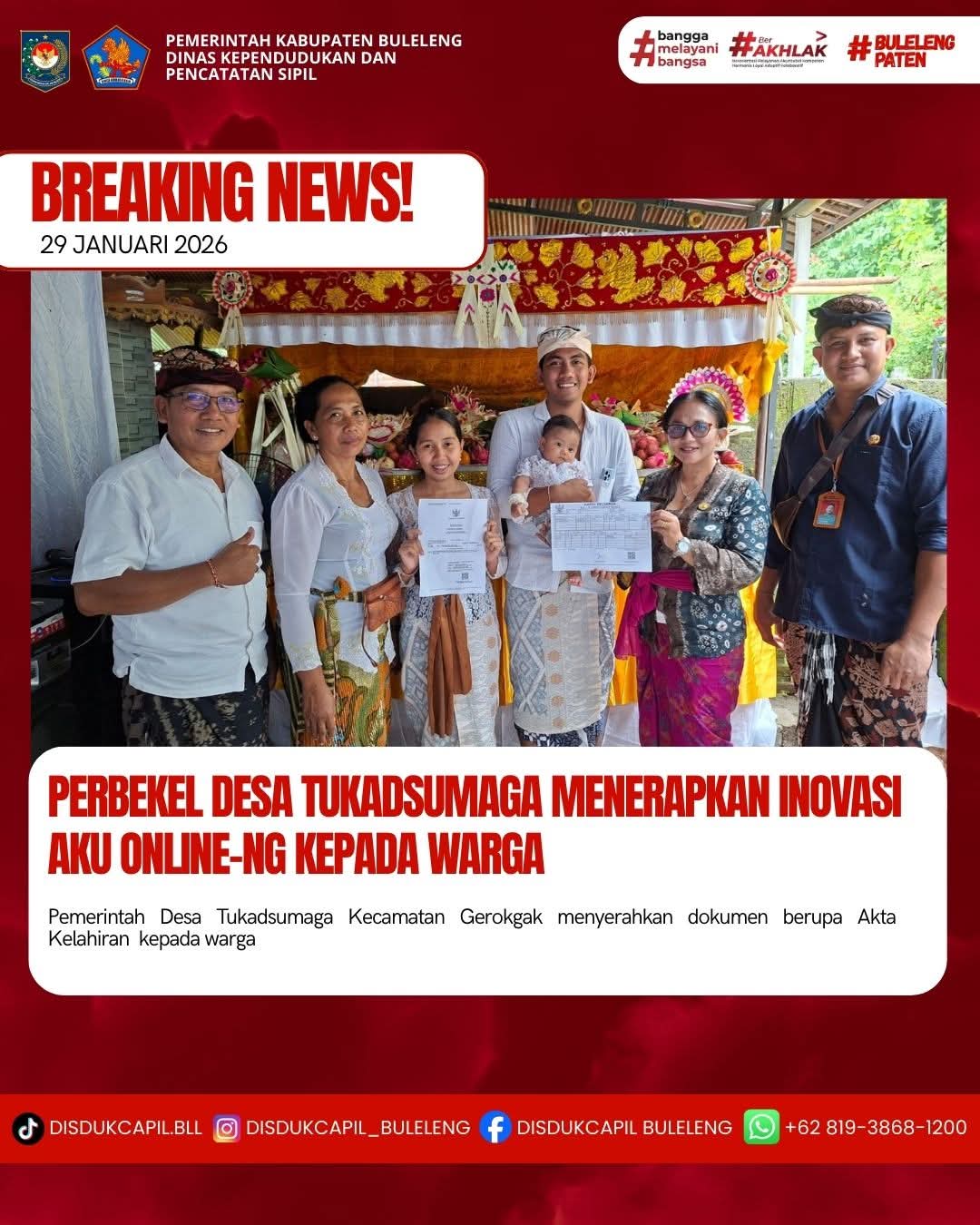 Pemerintah Kabupaten Buleleng melalui Dinas Kependudukan dan Pecatatan Sipil (Disdukcapil) Kabupaten Buleleng memaksimalkan serta mempermudah pelayanan kependudukan masyarakat dengan beberapa inovasi, melalui aplikasi AKU Online-NG. Dimana dalam penerapan aplikasi Aku Online-NG tersebut masyarakat tidak perlu lagi datang ke Dinas Dukcapil untuk melakukan pelayanan langsung cukup dengan datang ke Desa nanti akan dibantu oleh operator Desa masing-masing. Di Desa Tukadsumaga Kecamatan Gerokgak, telah diserahkan dokumen kependudukan berupa Akta Kelahiran atas nama Ni Luh Jenna Putri Ranika dan Kartu Keluarga atas nama I Made Doni Andika yang diserahkan oleh Perbekel Desa Tukadsumaga Anak Agung Sri Wathi didampingi oleh Kelian Banjar Dinas Gandongan Ketut Wira Sena di Desa Tukadsumaga, Selasa (27/1).