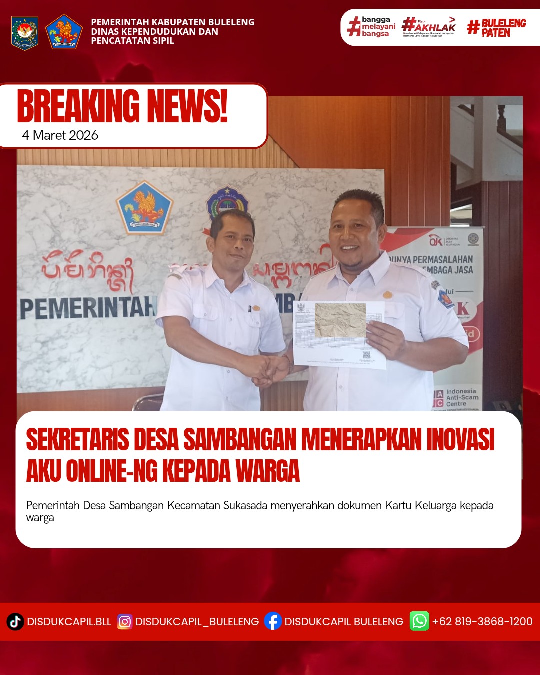 Pemerintah Kabupaten Buleleng melalui Dinas Kependudukan dan Pecatatan Sipil (Disdukcapil) Kabupaten Buleleng memaksimalkan serta mempermudah pelayanan kependudukan masyarakat dengan beberapa inovasi, melalui aplikasi AKU Online-NG. Dimana dalam penerapan aplikasi Aku Online-NG tersebut masyarakat tidak perlu lagi datang ke Dinas Dukcapil untuk melakukan pelayanan langsung cukup dengan datang ke Desa nanti akan dibantu oleh operator Desa masing-masing. Di Desa Sambangan Kecamatan Sukasada, telah diserahkan dokumen kependudukan berupa Kartu Keluarga atas nama Gede Eka Prawira Negara diserahkan oleh Sekretaris Desa Sambangan bertempat di Kantor Perbekel Desa Sambangan, Kecamatan Sukasada, Kabupaten Buleleng, Rabu (4/3).