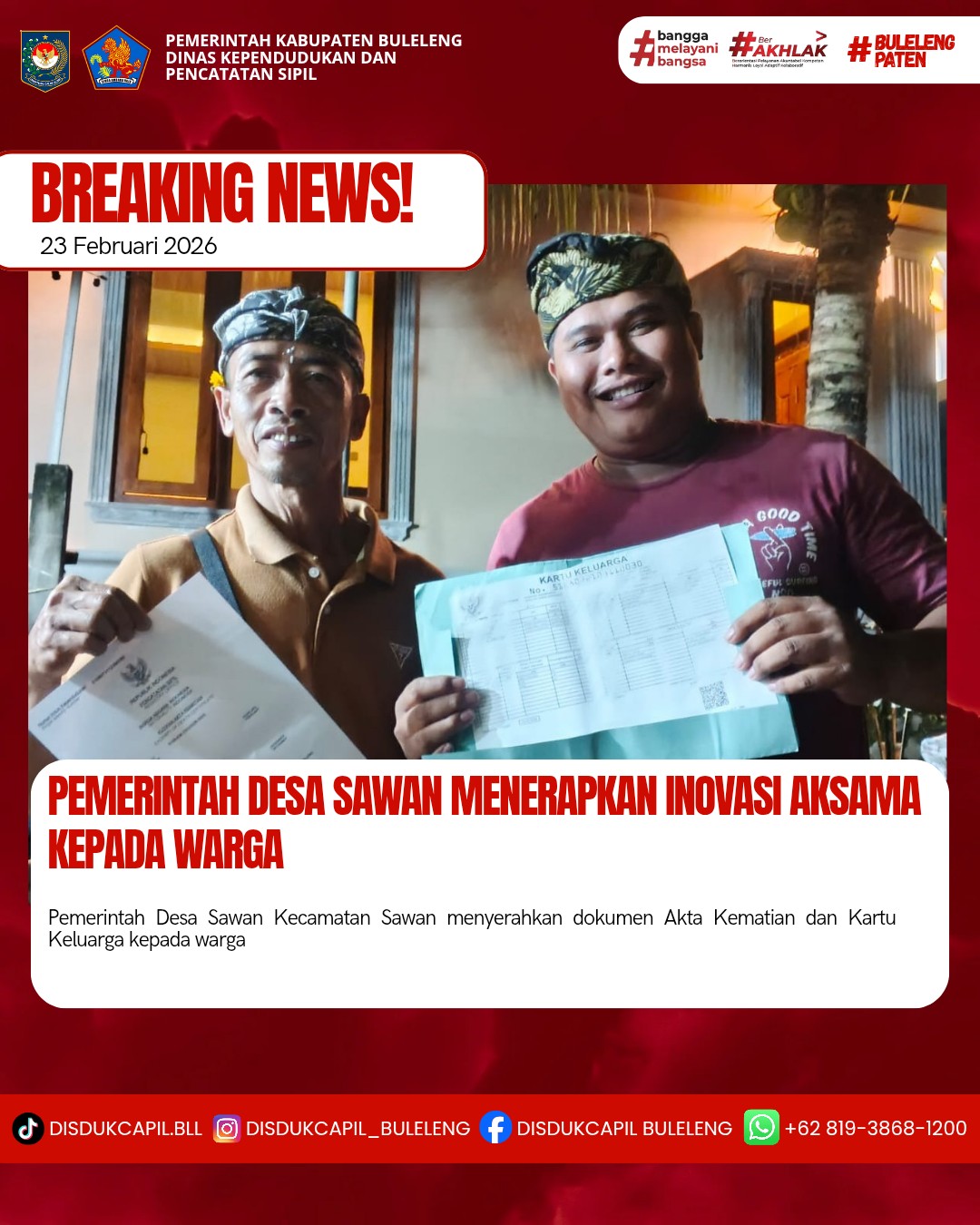 Pemerintah Kabupaten Buleleng melalui Dinas Kependudukan dan Pecatatan Sipil (Disdukcapil) Kabupaten Buleleng memaksimalkan serta mempermudah pelayanan kependudukan masyarakat dengan beberapa inovasi, yakni BALITA (Bayi Lahir Berakta), NYAKSI (Menyerahkan Akta Kawin Saat Acara Perkawinan) dan AKSAMA ( Akta Kematian Diserahkan Saat Masih Berduka) melalui aplikasi Aku Online. Di Desa Sawan Kecamatan Sawan, telah diterapkan program Aksama (Akta Kematian Diserahkan Saat Masih Berduka) yang dilakukan secara langsung oleh Kadus Kawanan Desa Sawan menyerahkan Akta Kematian atas nama Ketut Yata dan Kartu Keluarga di Desa Sawan, Kecamatan Sawan, Senin (23/2).