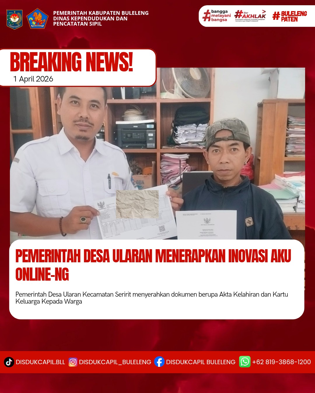 Pemerintah Kabupaten Buleleng melalui Dinas Kependudukan dan Pecatatan Sipil (Disdukcapil) Kabupaten Buleleng memaksimalkan serta mempermudah pelayanan kependudukan masyarakat dengan beberapa inovasi, melalui aplikasi AKU Online-NG. Dimana dalam penerapan aplikasi Aku Online-NG tersebut masyarakat tidak perlu lagi datang ke Dinas Dukcapil untuk melakukan pelayanan langsung cukup dengan datang ke Desa nanti akan dibantu oleh operator Desa masing-masing. Di Desa Ularan Kecamatan Seririt, telah diserahkan dokumen kependudukan berupa Akta Kelahiran dan Kartu Keluarga yang diterima oleh Kepala Keluarga Edy Natalia yang beralamat di BD Yadnya Kerthi Desa Ularan yang diserahkan langsung oleh Kasi Pemerintahan Desa Ularan bertempat di kantor Perbekel Desa Ularan, Kecamatan Seririt, Kabupaten Buleleng, Rabu (1/4).