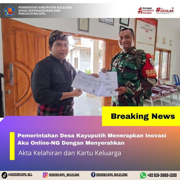 Pemerintah Kabupaten Buleleng melalui Dinas Kependudukan dan Pecatatan Sipil (Disdukcapil) Kabupaten Buleleng memaksimalkan serta mempermudah pelayanan kependudukan masyarakat dengan beberapa inovasi, melalui aplikasi AKU Online-NG. Dimana dalam penerapan aplikasi Aku Online-NG tersebut masyarakat tidak perlu lagi datang ke Dinas Dukcapil untuk melakukan pelayanan langsung cukup dengan datang ke Desa nanti akan dibantu oleh operator Desa masing-masing. Di Desa Kayuputih Kecamatan Sukasada, telah diserahkan dokumen kependudukan berupa Akta Kelahiran atas nama Kadek Nathan Satria Atmaja dan Kartu Keluarga atas nama Kadek Wiratmaja yang diserahkan langsung oleh Pemerintahan Desa Kayuputih Kecamatan Sukasada bertempat di kantor Perbekel Desa Kayuputih, Kecamatan Sukasada, Kabupaten Buleleng, Senin (25/8).