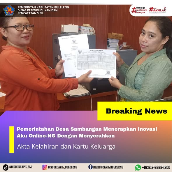 Pemerintah Kabupaten Buleleng melalui Dinas Kependudukan dan Pecatatan Sipil (Disdukcapil) Kabupaten Buleleng memaksimalkan serta mempermudah pelayanan kependudukan masyarakat dengan beberapa inovasi, melalui aplikasi AKU Online-NG. Dimana dalam penerapan aplikasi Aku Online-NG tersebut masyarakat tidak perlu lagi datang ke Dinas Dukcapil untuk melakukan pelayanan langsung cukup dengan datang ke Desa nanti akan dibantu oleh operator Desa masing-masing. Di Desa Sambangan Kecamatan Sukasada, telah diserahkan dokumen kependudukan berupa Akta Kelahiran atas nama Gustu Made Nanda Pradnyani dan Kartu Keluarga atas nama Gusti Putu Antara Putra yang diserahkan oleh Kasi Pemerintahan Desa Sambangan kepada warga bertempat di Kantor Perbekel Desa Sambangan, Kecamatan Sukasada, Kabupaten Buleleng, Kamis (11/12).