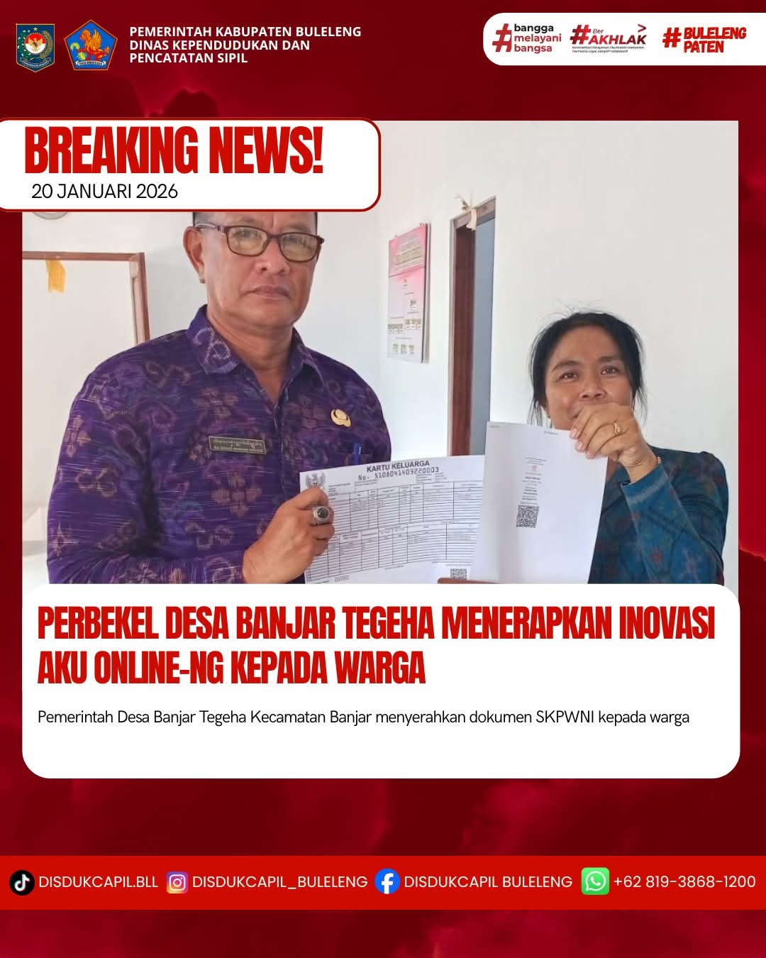 Pemerintah Kabupaten Buleleng melalui Dinas Kependudukan dan Pecatatan Sipil (Disdukcapil) Kabupaten Buleleng memaksimalkan serta mempermudah pelayanan kependudukan masyarakat dengan beberapa inovasi, melalui aplikasi AKU Online-NG. Dimana dalam penerapan aplikasi Aku Online-NG tersebut masyarakat tidak perlu lagi datang ke Dinas Dukcapil untuk melakukan pelayanan langsung cukup dengan datang ke Desa nanti akan dibantu oleh operator Desa masing-masing. Di Desa Banjar Tegeha Kecamatan Banjar, telah diserahkan dokumen kependudukan berupa SKPWNI Kadek Ani Krisnawati yang diserahkan secara langsung oleh Perbekel Desa Banjar Tegeha Ida Bagus Komang Sistiadi, Selasa (20/1).