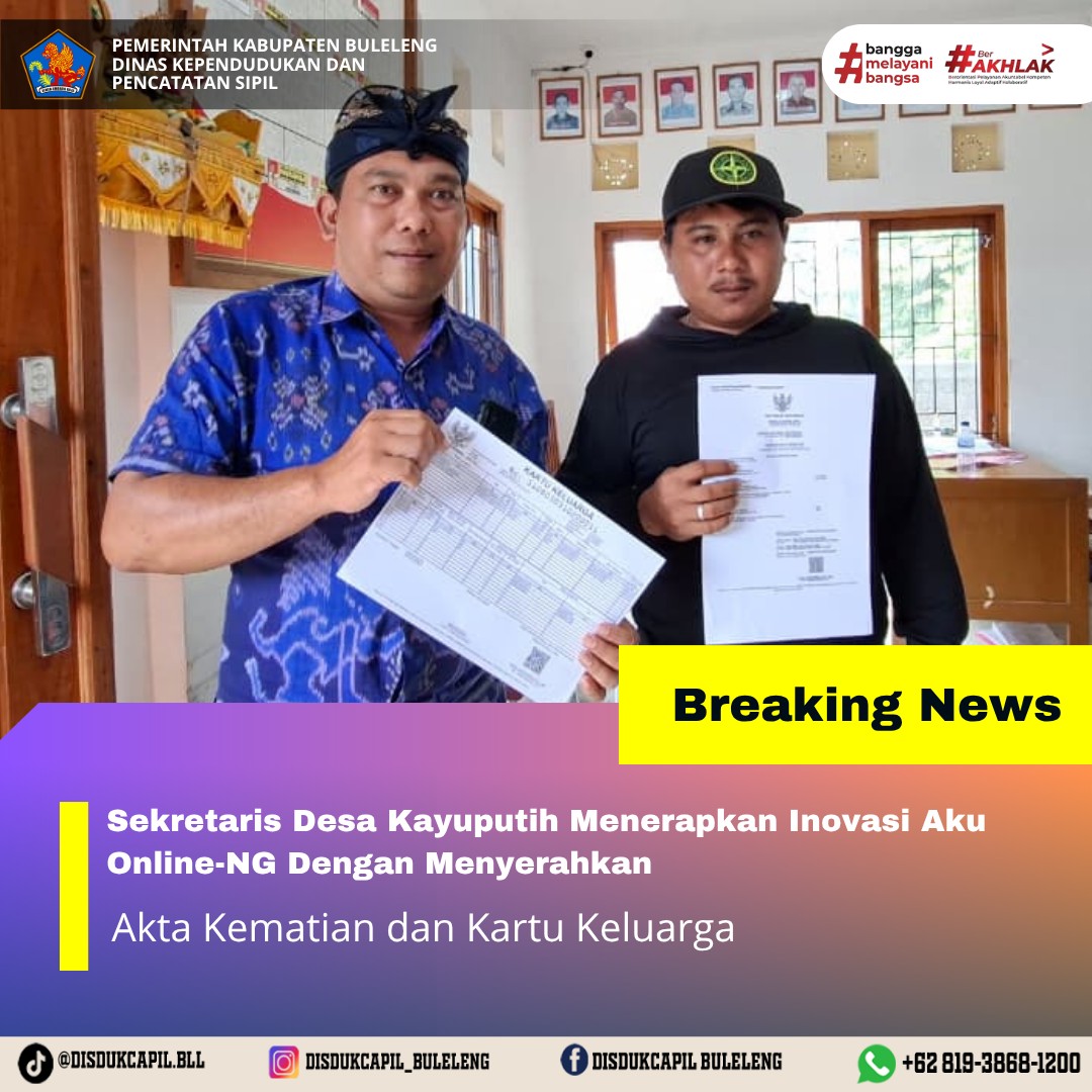 Pemerintah Kabupaten Buleleng melalui Dinas Kependudukan dan Pecatatan Sipil (Disdukcapil) Kabupaten Buleleng memaksimalkan serta mempermudah pelayanan kependudukan masyarakat dengan beberapa inovasi, melalui aplikasi AKU Online-NG. Dimana dalam penerapan aplikasi Aku Online-NG tersebut masyarakat tidak perlu lagi datang ke Dinas Dukcapil untuk melakukan pelayanan langsung cukup dengan datang ke Desa nanti akan dibantu oleh operator Desa masing-masing. Di Desa Kayuputih Kecamatan Sukasada, telah diserahkan dokumen kependudukan berupa Akta Kematian atas nama Komang Ayuni dan Kartu Keluarga atas nama Gede Sadnaya yang diserahkan langsung oleh Sekretaris Desa Kayuputih Kecamatan Sukasada bertempat di kantor Perbekel Desa Kayuputih, Kecamatan Sukasada, Kabupaten Buleleng, Kamis (23/10).