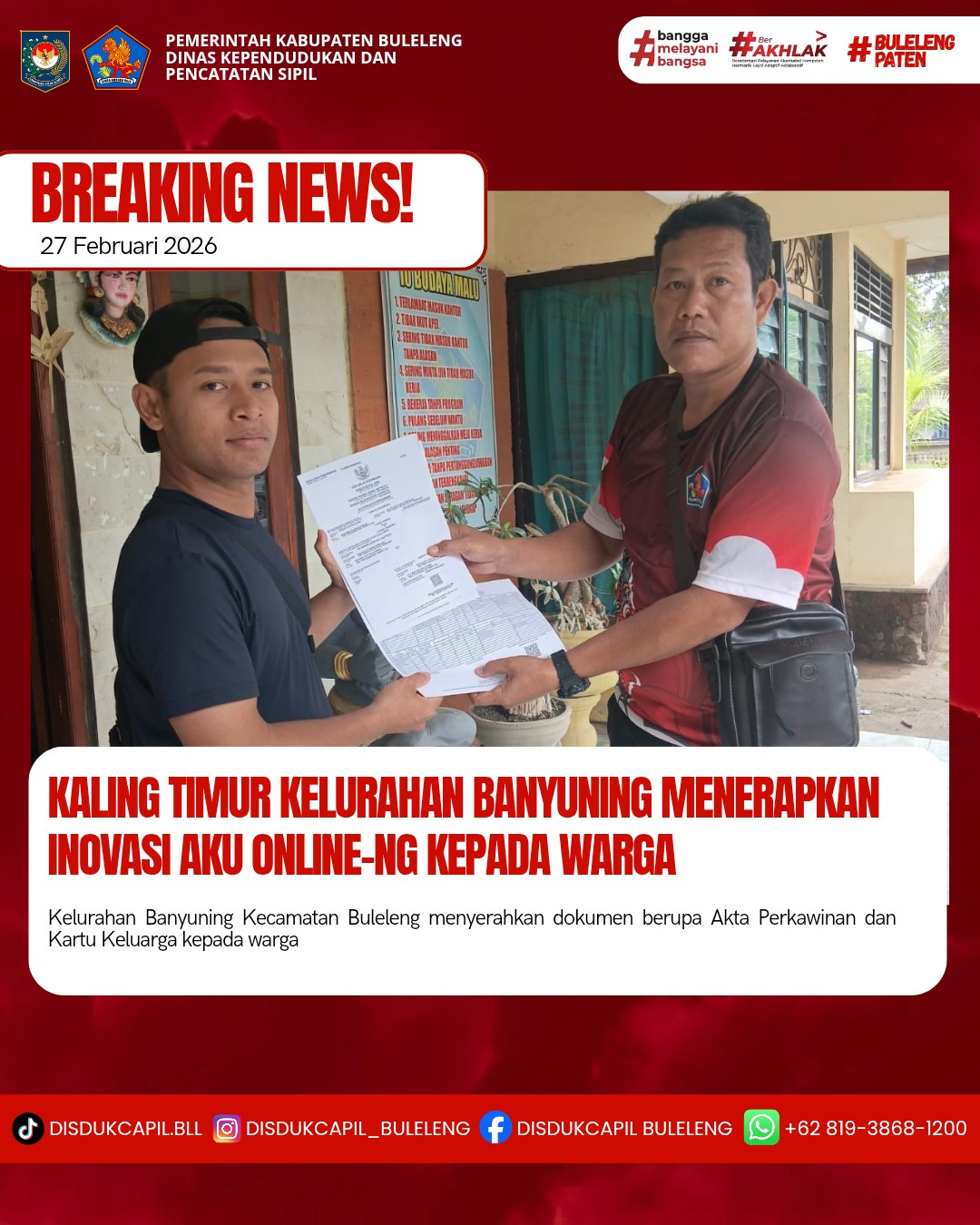 Pemerintah Kabupaten Buleleng melalui Dinas Kependudukan dan Pecatatan Sipil (Disdukcapil) Kabupaten Buleleng memaksimalkan serta mempermudah pelayanan kependudukan masyarakat dengan beberapa inovasi, melalui aplikasi AKU Online-NG. Dimana dalam penerapan aplikasi Aku Online-NG tersebut masyarakat tidak perlu lagi datang ke Dinas Dukcapil untuk melakukan pelayanan langsung cukup dengan datang ke Desa nanti akan dibantu oleh operator Desa masing-masing. Di Kelurahan Banyuning Kecamatan Buleleng, telah diserahkan dokumen kependudukan berupa Akta Perkawinan dan Kartu Keluarga warga Kelurahan Banyuning yang diserahkan langsung oleh Kaling Timur Kelurahan Banyuning Kecamatan Buleleng, Kabupaten Buleleng, Jumat (27/2).