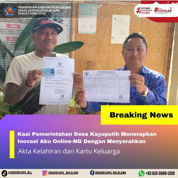Pemerintah Kabupaten Buleleng melalui Dinas Kependudukan dan Pecatatan Sipil (Disdukcapil) Kabupaten Buleleng memaksimalkan serta mempermudah pelayanan kependudukan masyarakat dengan beberapa inovasi, melalui aplikasi AKU Online-NG. Dimana dalam penerapan aplikasi Aku Online-NG tersebut masyarakat tidak perlu lagi datang ke Dinas Dukcapil untuk melakukan pelayanan langsung cukup dengan datang ke Desa nanti akan dibantu oleh operator Desa masing-masing. Di Desa Kayuputih Kecamatan Sukasada, telah diserahkan dokumen kependudukan berupa Akta Kelahiran, KTP dan Kartu Keluarga atas nama I Kadek Budi Astrawan yang diserahkan langsung oleh Kasi Pemerintahan Desa Kayuputih Kecamatan Sukasada bertempat di kantor Perbekel Desa Kayuputih, Kecamatan Sukasada, Kabupaten Buleleng, Selasa (26/8).