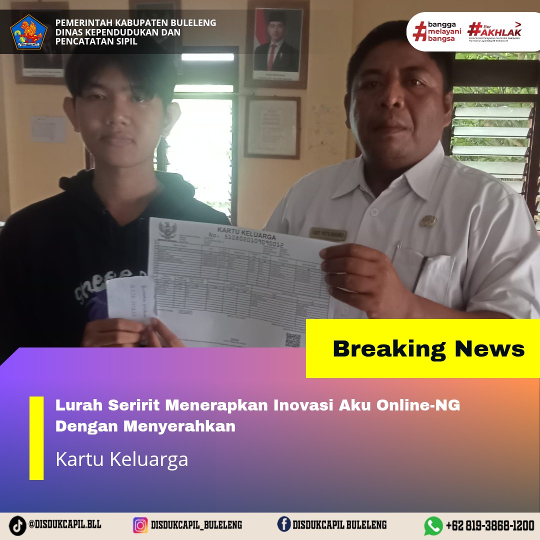 Pemerintah Kabupaten Buleleng melalui Dinas Kependudukan dan Pecatatan Sipil (Disdukcapil) Kabupaten Buleleng memaksimalkan serta mempermudah pelayanan kependudukan masyarakat dengan beberapa inovasi, melalui aplikasi AKU Online-NG. Dimana dalam penerapan aplikasi Aku Online-NG tersebut masyarakat tidak perlu lagi datang ke Dinas Dukcapil untuk melakukan pelayanan langsung cukup dengan datang ke Desa nanti akan dibantu oleh operator Desa masing-masing. Di Kelurahan Seririt Kecamatan Seririt, telah diserahkan dokumen kependudukan berupa Kartu Keluarga atas nama Subhan yang diserahkan langsung oleh Lurah Seririt Kecamatan Seririt, Kabupaten Buleleng, Rabu (3/12).