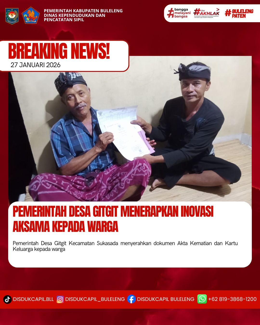 Pemerintah Kabupaten Buleleng melalui Dinas Kependudukan dan Pecatatan Sipil (Disdukcapil) Kabupaten Buleleng memaksimalkan serta mempermudah pelayanan kependudukan masyarakat dengan beberapa inovasi, yakni BALITA (Bayi Lahir Berakta), NYAKSI (Menyerahkan Akta Kawin Saat Acara Perkawinan) dan AKSAMA ( Akta Kematian Diserahkan Saat Masih Berduka) melalui aplikasi Aku Online. Di Desa Gitgit Kecamatan Sukasada, telah diterapkan program Aksama (Akta Kematian Diserahkan Saat Masih Berduka) yang dilakukan secara langsung oleh Kelian Banjar Dinas Pumahan dengan menyerahkan Akta Kematian dan Kartu Keluarga atas nama Made Sriani yang diterima langsung oleh keluarganya di Desa Gitgit, Kecamatan Sukasada, Selasa (27/1).