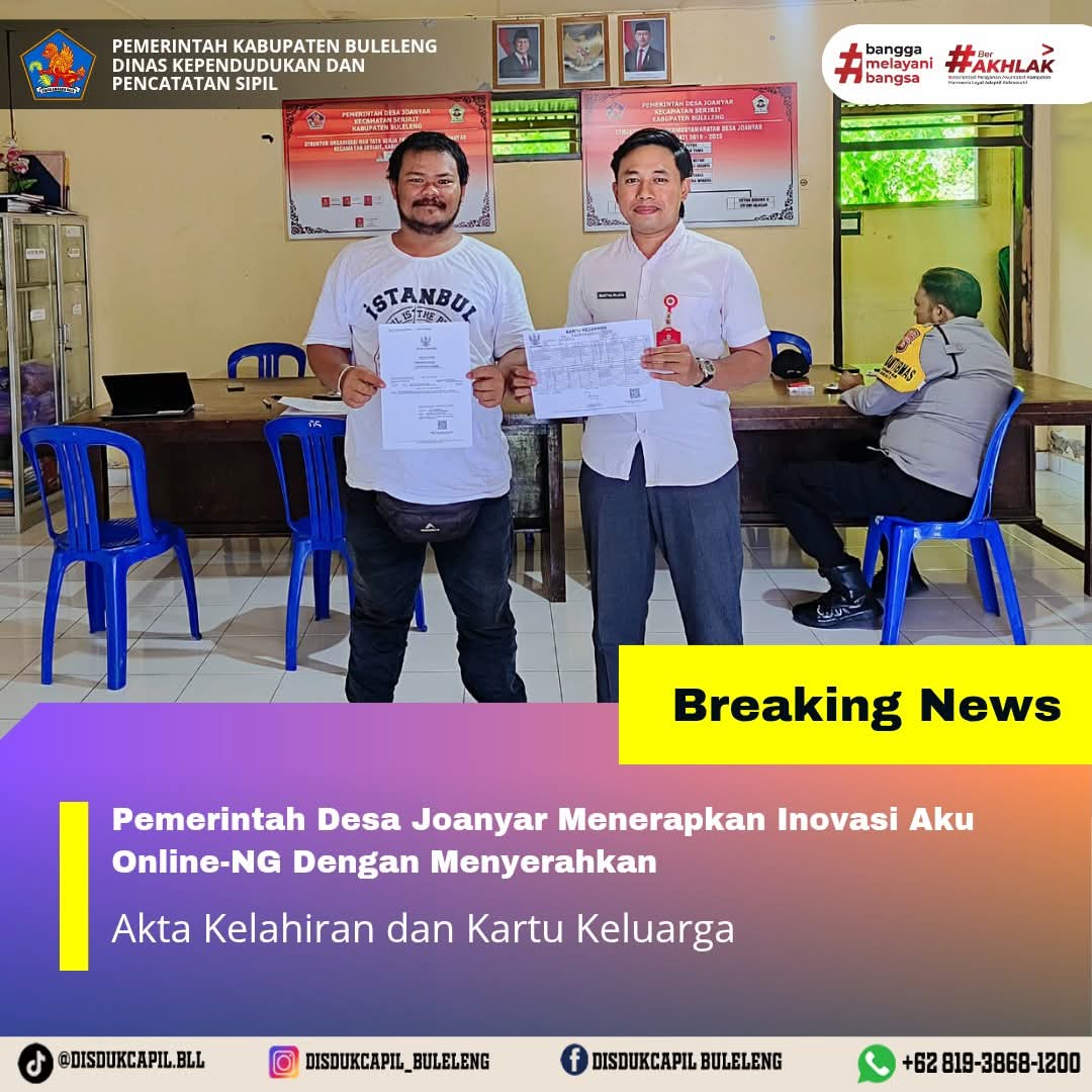Pemerintah Kabupaten Buleleng melalui Dinas Kependudukan dan Pecatatan Sipil (Disdukcapil) Kabupaten Buleleng memaksimalkan serta mempermudah pelayanan kependudukan masyarakat dengan beberapa inovasi, melalui aplikasi AKU Online-NG. Dimana dalam penerapan aplikasi Aku Online-NG tersebut masyarakat tidak perlu lagi datang ke Dinas Dukcapil untuk melakukan pelayanan langsung cukup dengan datang ke Desa nanti akan dibantu oleh operator Desa masing-masing. Di Desa Joanyar Kecamatan Seririt, telah diserahkan dokumen kependudukan berupa Akta Kelahiran atas nama Komang Shaka Lingga Sanjaya dan Kartu Keluarga atas nama Kadek Adi Sanjaya yang diserahkan secara langsung oleh Kasi Pemerintahan Desa Joanyar Kecamatan Seririt, Rabu (3/12).