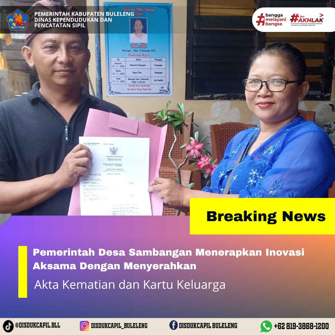 Pemerintah Kabupaten Buleleng melalui Dinas Kependudukan dan Pecatatan Sipil (Disdukcapil) Kabupaten Buleleng memaksimalkan serta mempermudah pelayanan kependudukan masyarakat dengan beberapa inovasi, yakni BALITA (Bayi Lahir Berakta), NYAKSI (Menyerahkan Akta Kawin Saat Acara Perkawinan) dan AKSAMA ( Akta Kematian Diserahkan Saat Masih Berduka) melalui aplikasi Aku Online. Di Desa Sambangan Kecamatan Sukasada, telah diterapkan program Aksama (Akta Kematian Diserahkan Saat Masih Berduka) yang dilakukan secara langsung oleh Pemerintah Desa Sambangan dengan menyerahkan Akta Kematian atas nama Putu Adi dan Kartu Keluarga kepada keluarga almarhum yang beralamat Banjar Dinas Babakan Desa Sambangan Kecamatan Sukasada, Jumat (14/11).