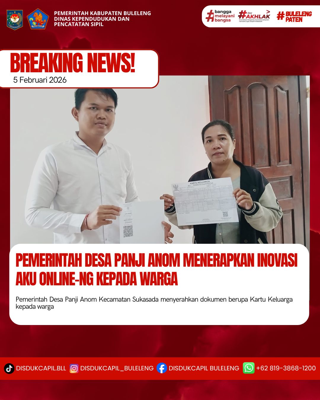 Pemerintah Kabupaten Buleleng melalui Dinas Kependudukan dan Pecatatan Sipil (Disdukcapil) Kabupaten Buleleng memaksimalkan serta mempermudah pelayanan kependudukan masyarakat dengan beberapa inovasi, melalui aplikasi AKU Online-NG. Dimana dalam penerapan aplikasi Aku Online-NG tersebut masyarakat tidak perlu lagi datang ke Dinas Dukcapil untuk melakukan pelayanan langsung cukup dengan datang ke Desa nanti akan dibantu oleh operator Desa masing-masing. Di Desa Panji Anom Kecamatan Sukasada, telah diserahkan dokumen kependudukan berupa Kartu Keluarga atas nama MADE DANAYASA yang diserahkan langsung oleh Kasi Pemerintahan Desa Panji Anom bertempat di Kantor Perbekel Panji Anom, Kecamatan Sukasada, Kamis (5/2).
