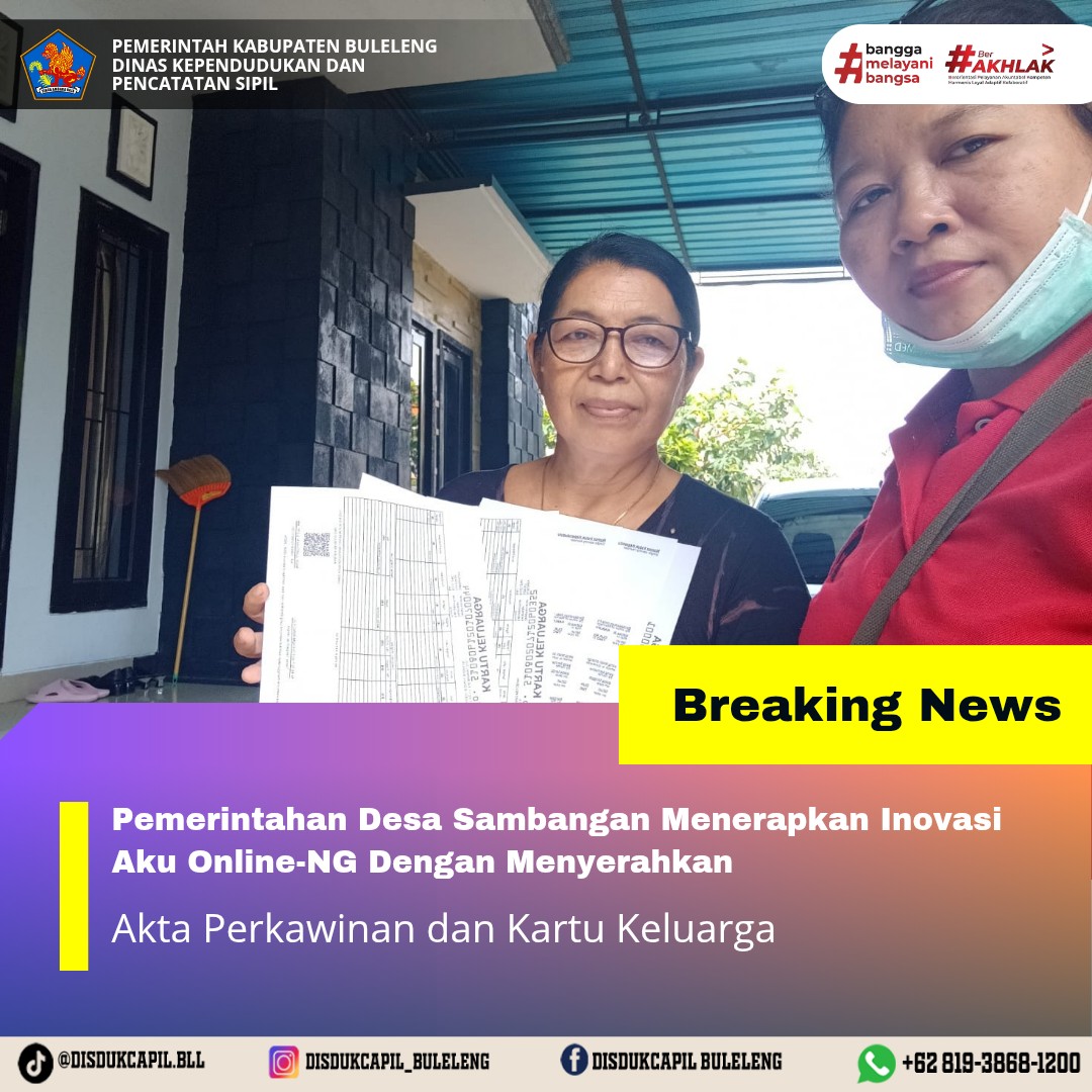 Pemerintah Kabupaten Buleleng melalui Dinas Kependudukan dan Pecatatan Sipil (Disdukcapil) Kabupaten Buleleng memaksimalkan serta mempermudah pelayanan kependudukan masyarakat dengan beberapa inovasi, melalui aplikasi AKU Online-NG. Dimana dalam penerapan aplikasi Aku Online-NG tersebut masyarakat tidak perlu lagi datang ke Dinas Dukcapil untuk melakukan pelayanan langsung cukup dengan datang ke Desa nanti akan dibantu oleh operator Desa masing-masing. Di Desa Sambangan Kecamatan Sukasada, telah diserahkan dokumen kependudukan berupa Akta Perkawinan dan Kartu Keluarga atas nama Nyoman Didit Suasta Adijaya dan Kartu Keluarga masing-masing orang tua yang diserahkan oleh Pemerintahan Desa Sambangan kepada warga bertempat di Kantor Perbekel Desa Sambangan, Kecamatan Sukasada, Kabupaten Buleleng, Rabu (26/11).