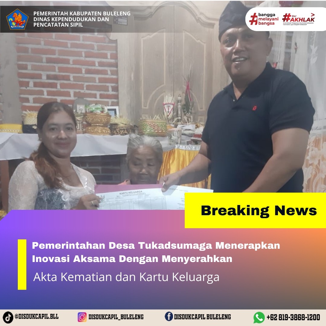 Pemerintah Kabupaten Buleleng melalui Dinas Kependudukan dan Pecatatan Sipil (Disdukcapil) Kabupaten Buleleng memaksimalkan serta mempermudah pelayanan kependudukan masyarakat dengan beberapa inovasi, yakni BALITA (Bayi Lahir Berakta), NYAKSI (Menyerahkan Akta Kawin Saat Acara Perkawinan) dan AKSAMA ( Akta Kematian Diserahkan Saat Masih Berduka) melalui aplikasi Aku Online. Di Desa Tukadsumaga Kecamatan Gerokgak, telah diterapkan program Aksama (Akta Kematian Diserahkan Saat Masih Berduka) yang dilakukan secara langsung oleh Kelian Banjar Dinas Buluh Desa Tukadsumaga dengan menyerahkan Akta Kematian atas nama I Gede Kusnadi dan Kartu Keluarga Ni Made Sari di Desa Tukadusumaga Kecamatan Gerokgak, Selasa (23/9).