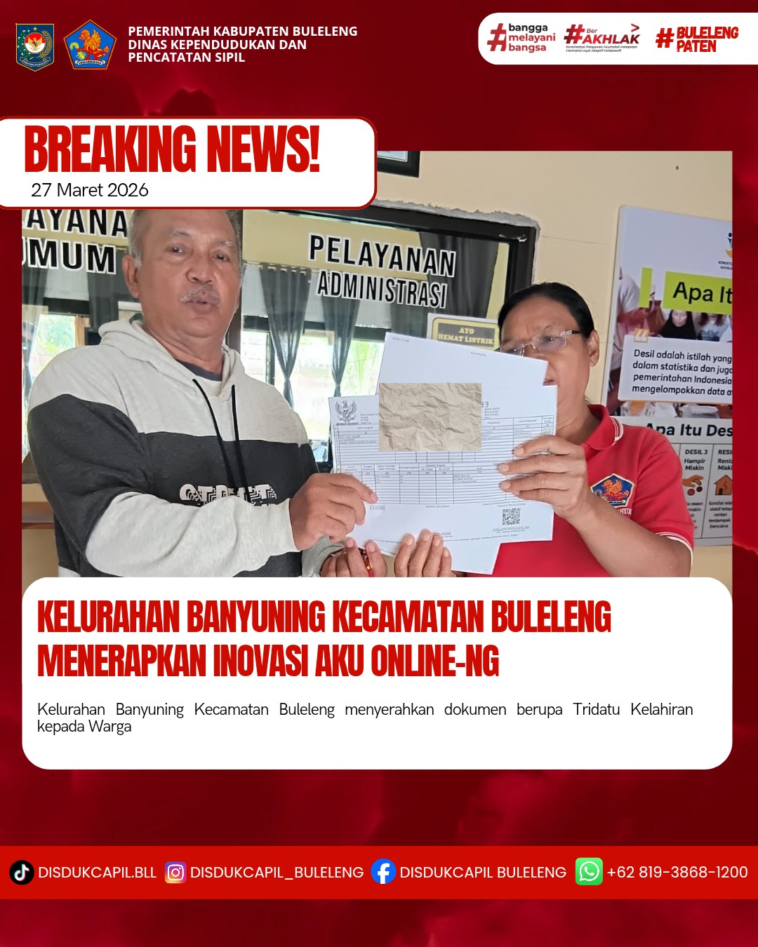 Pemerintah Kabupaten Buleleng melalui Dinas Kependudukan dan Pecatatan Sipil (Disdukcapil) Kabupaten Buleleng memaksimalkan serta mempermudah pelayanan kependudukan masyarakat dengan beberapa inovasi, melalui aplikasi AKU Online-NG. Dimana dalam penerapan aplikasi Aku Online-NG tersebut masyarakat tidak perlu lagi datang ke Dinas Dukcapil untuk melakukan pelayanan langsung, cukup dengan datang ke Desa nanti akan dibantu oleh operator Desa masing-masing. Di Kelurahan Banyuning Kecamatan Buleleng, telah diserahkan dokumen kependudukan berupa Tridatu Akta Kelahiran warga Kelurahan Banyuning yang diserahkan langsung oleh Staf Kelurahan Banyuning Kecamatan Buleleng, Kabupaten Buleleng, Jumat (27/3).